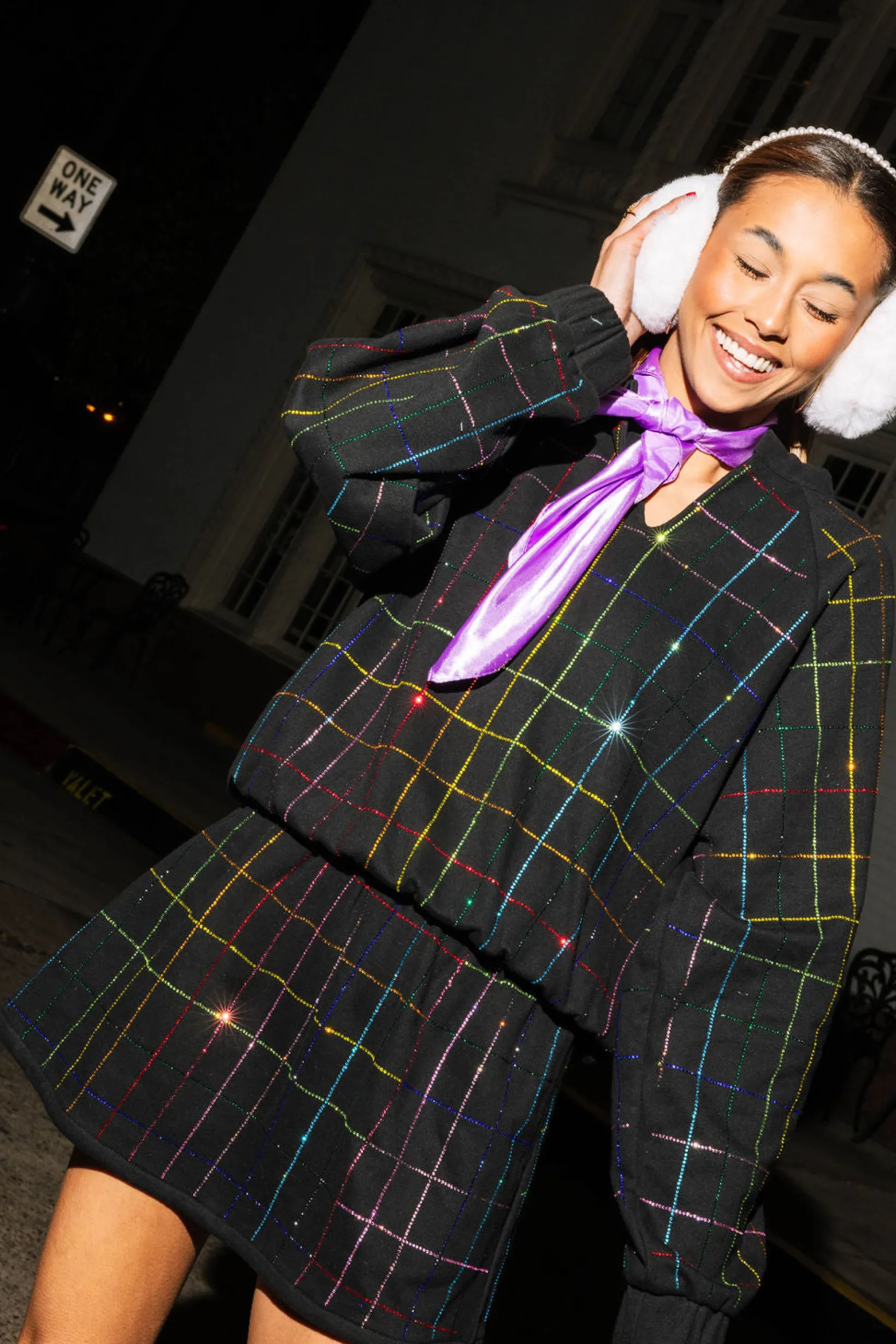 Black Multi Rhinestone Plaid V Neck Sweatshirt