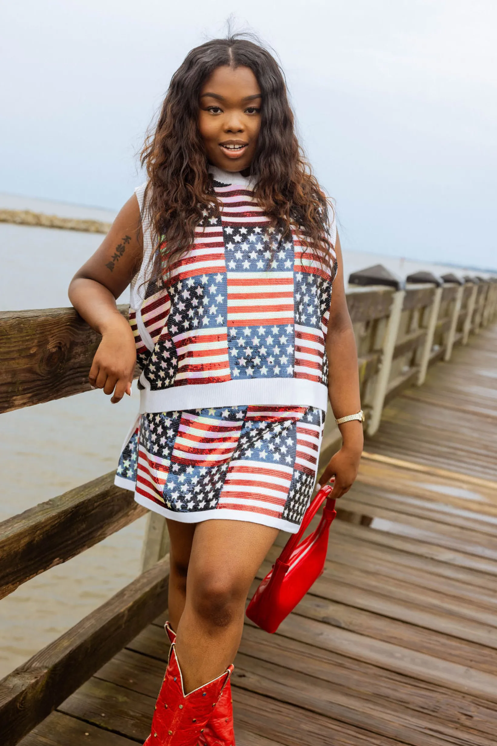 Get ready to shine this Independence Day! Our high-waisted skirt has a loose, a-line fit in a mini-skirt length. Complete with a full sequin stars and stripes design. Be sure to style it with the matching sweater vest!🇺🇸✨