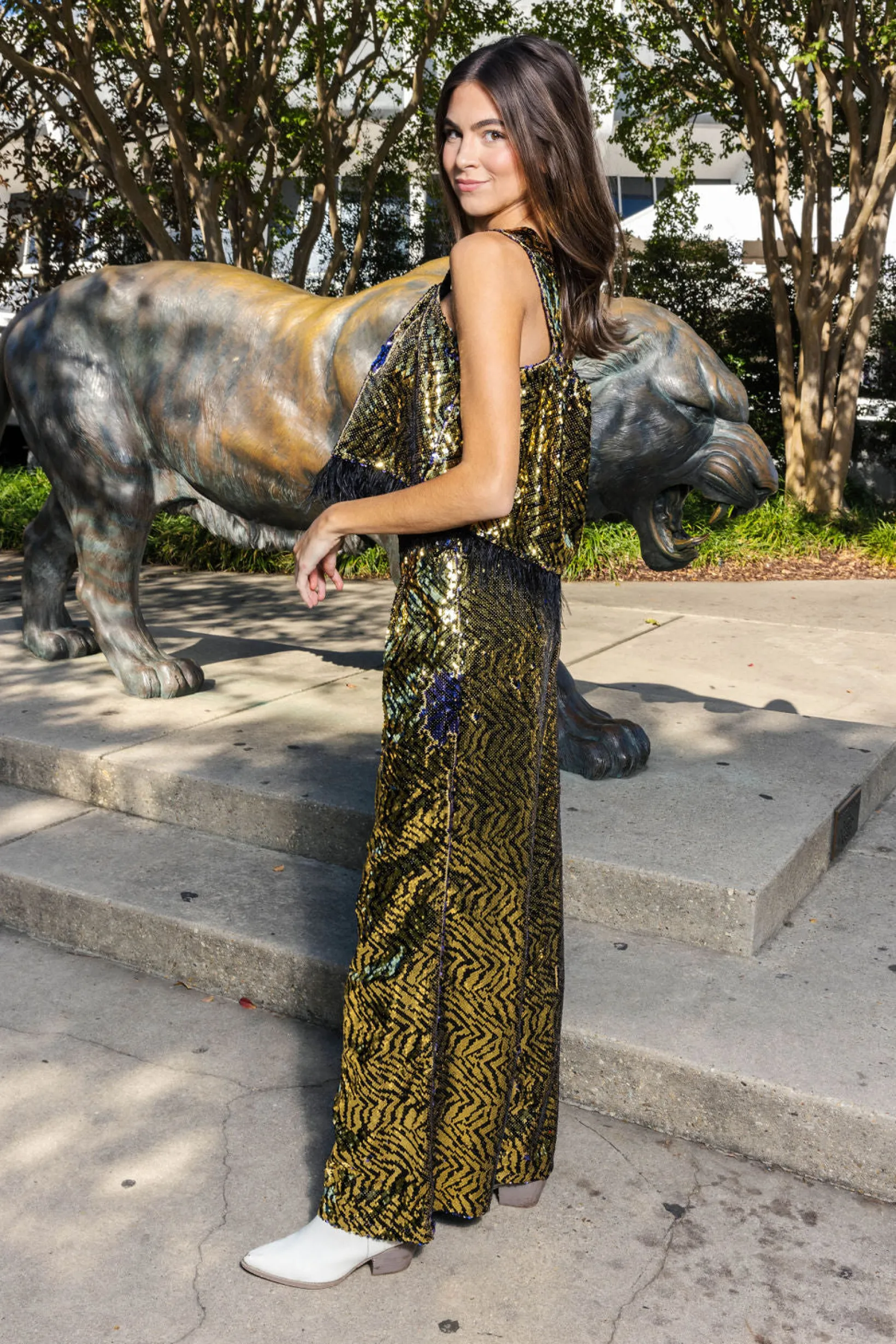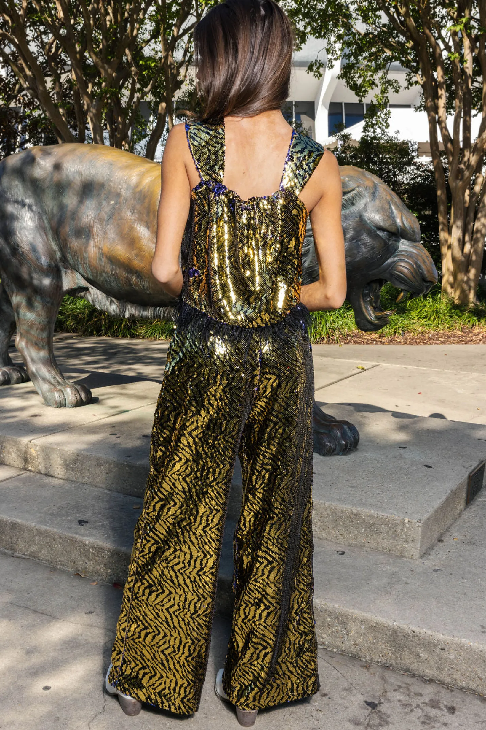 This Gold & Black Sequin Tiger Feather Tank is made from soft fabric with a loose, slight crop fit design. It features a gorgeous sequin tiger stripe design, complete with feather detailing along the bottom. Perfect for making a statement, pair it with the matching pants for the ultimate look.