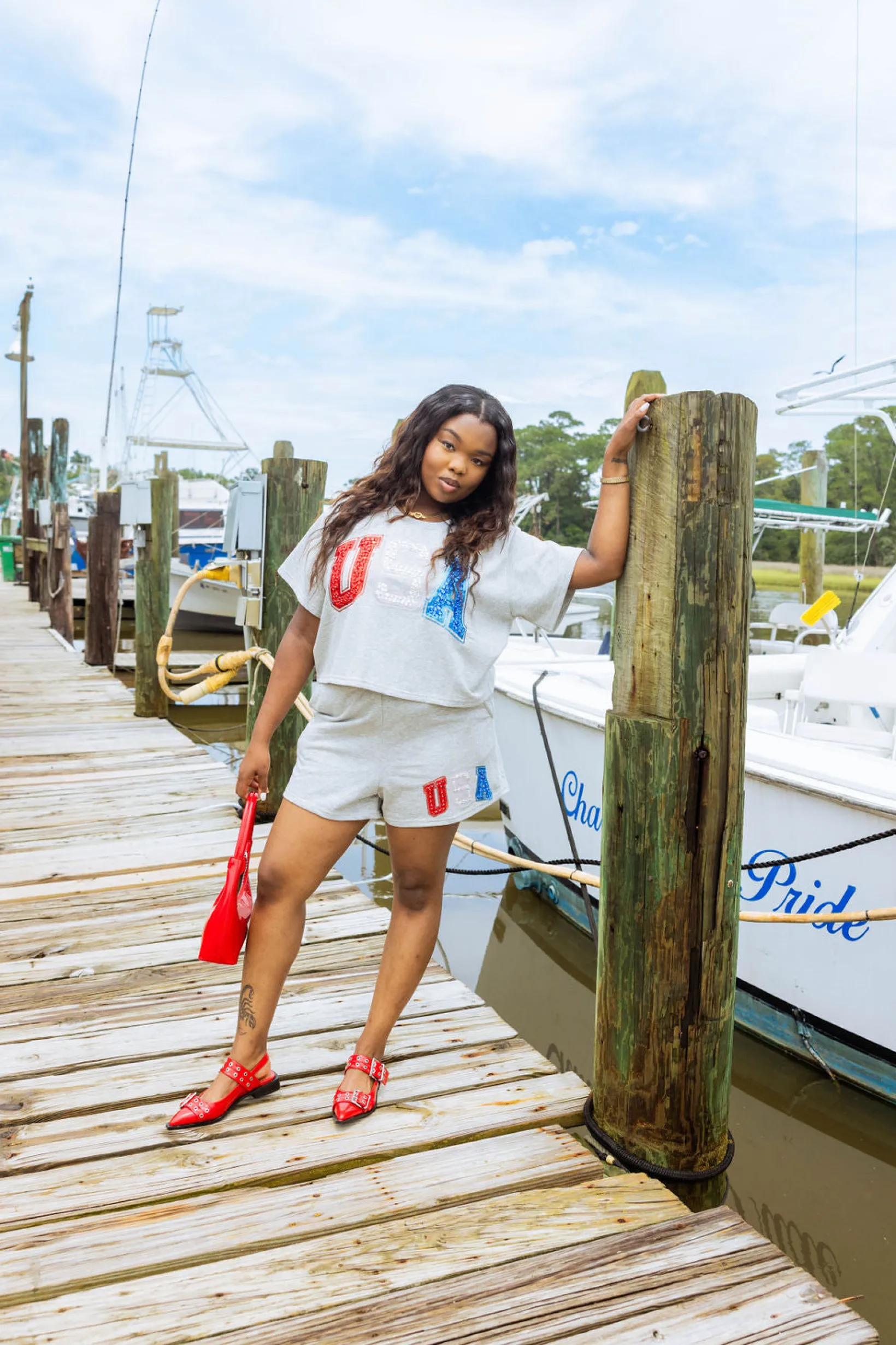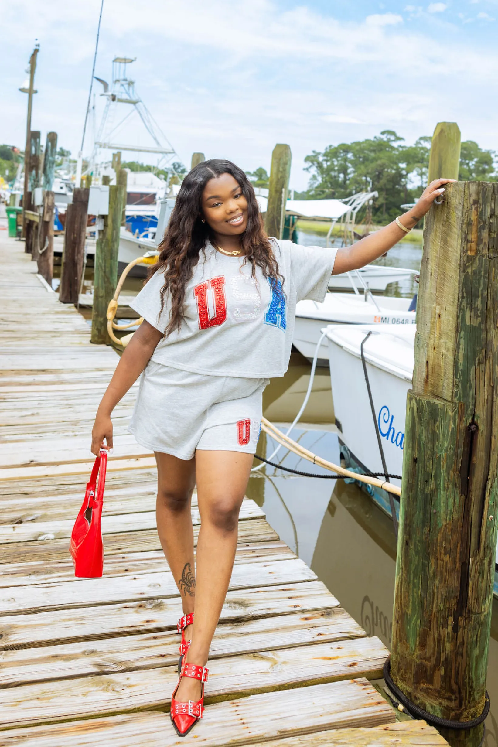 Celebrate in style with our Grey Rhinestone ‘USA’ Shorts! Perfect for the 4th of July, these shorts feature sparkling rhinestones and a playful ‘USA’ design. Pair with a white top or our matching shirt for a fun and festive look! ππΊπΈ