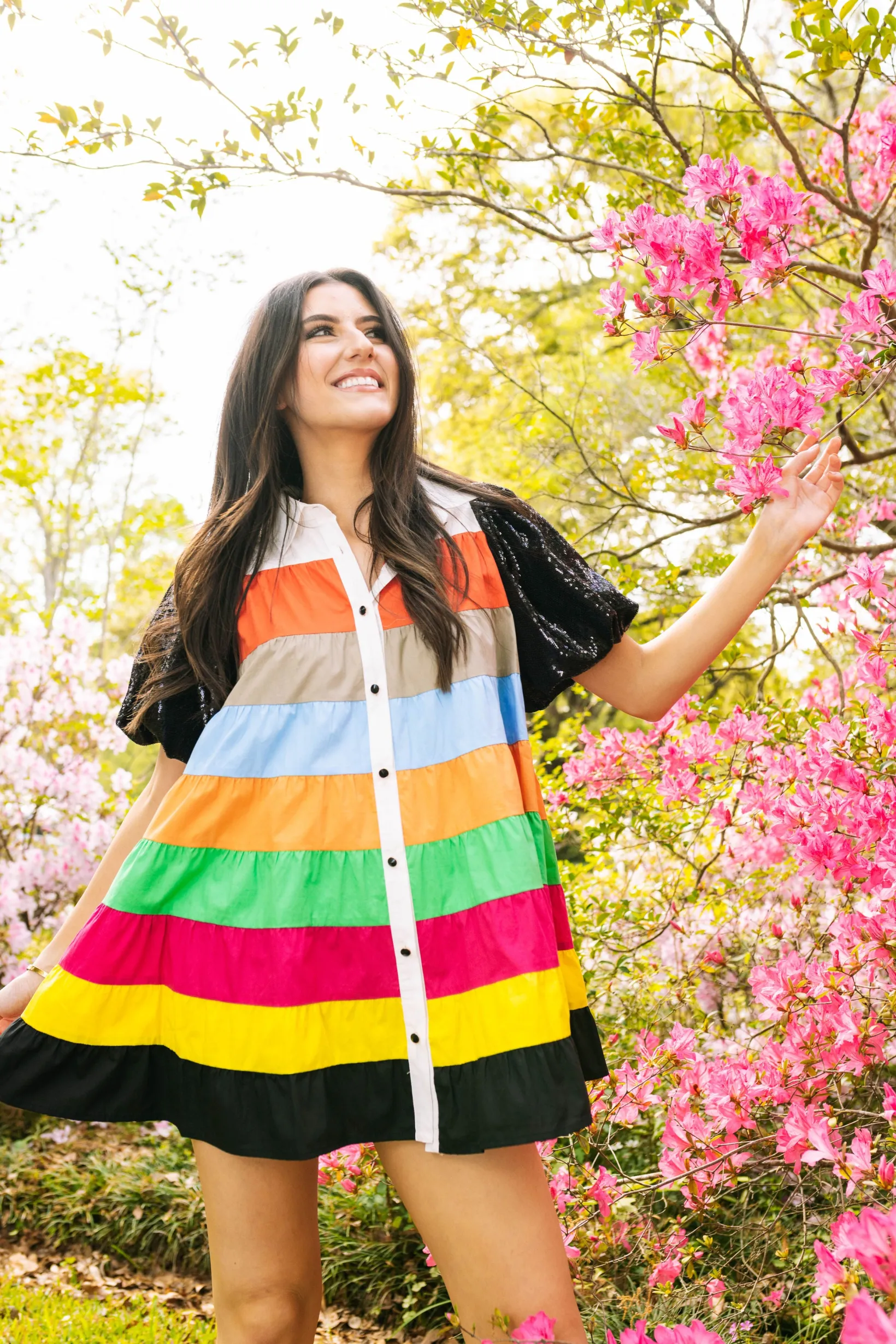 Twirl into the spring season! Our tiered poof sleeve dress features a button up design and poof sleeves in a cotton fabric. It features a rainbow tiered design, perfect for adding a pop of color to your wardrobe. Don’t miss out on this must-have piece from our spring collection! 🌈🖤