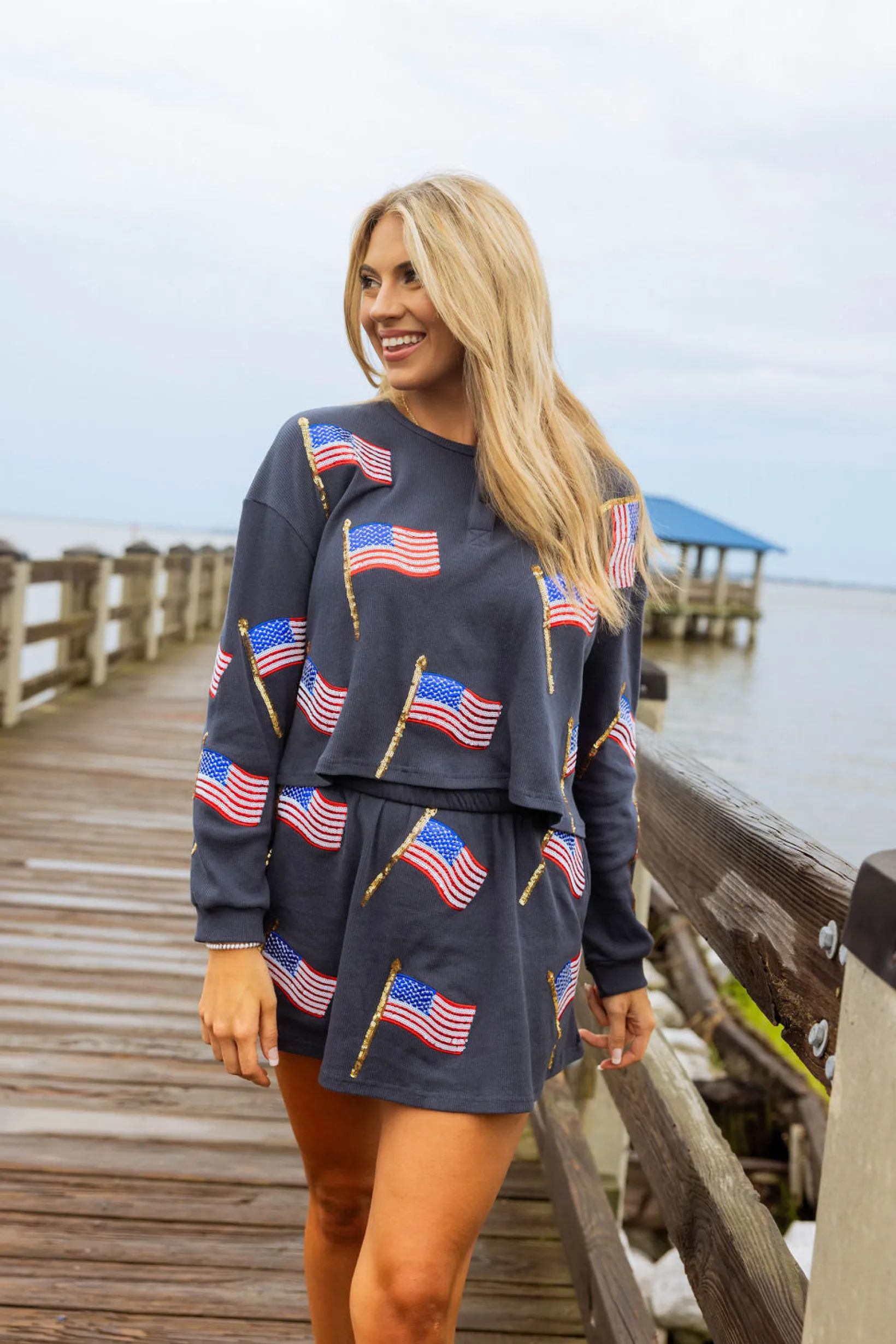 Get ready to feel comfy and stylish in our Navy Metallic Flag Waffle Top! Made with our favorite waffle material, this top is perfect for any occasion. With metallic American flags adorning it, it’s the perfect piece for your 4th of July celebrations. Pair it with our matching shorts for an extra patriotic look! 🇺🇸🔥