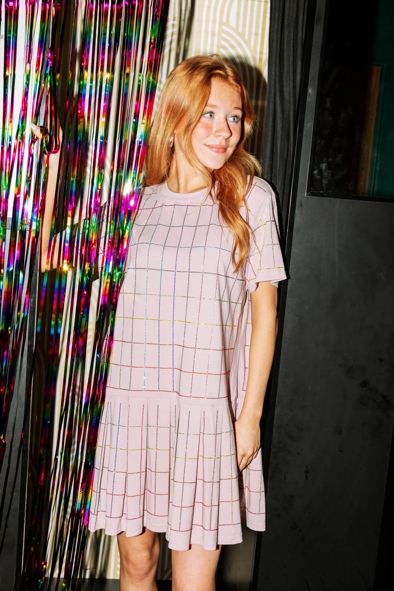This stylish Pink Rhinestone Plaid Tee Dress is perfect for the holidays. Its loose fit and drop waist make it easy to move and comfortable to wear. The dress is adorned with a rhinestone plaid design that adds a festive touch.