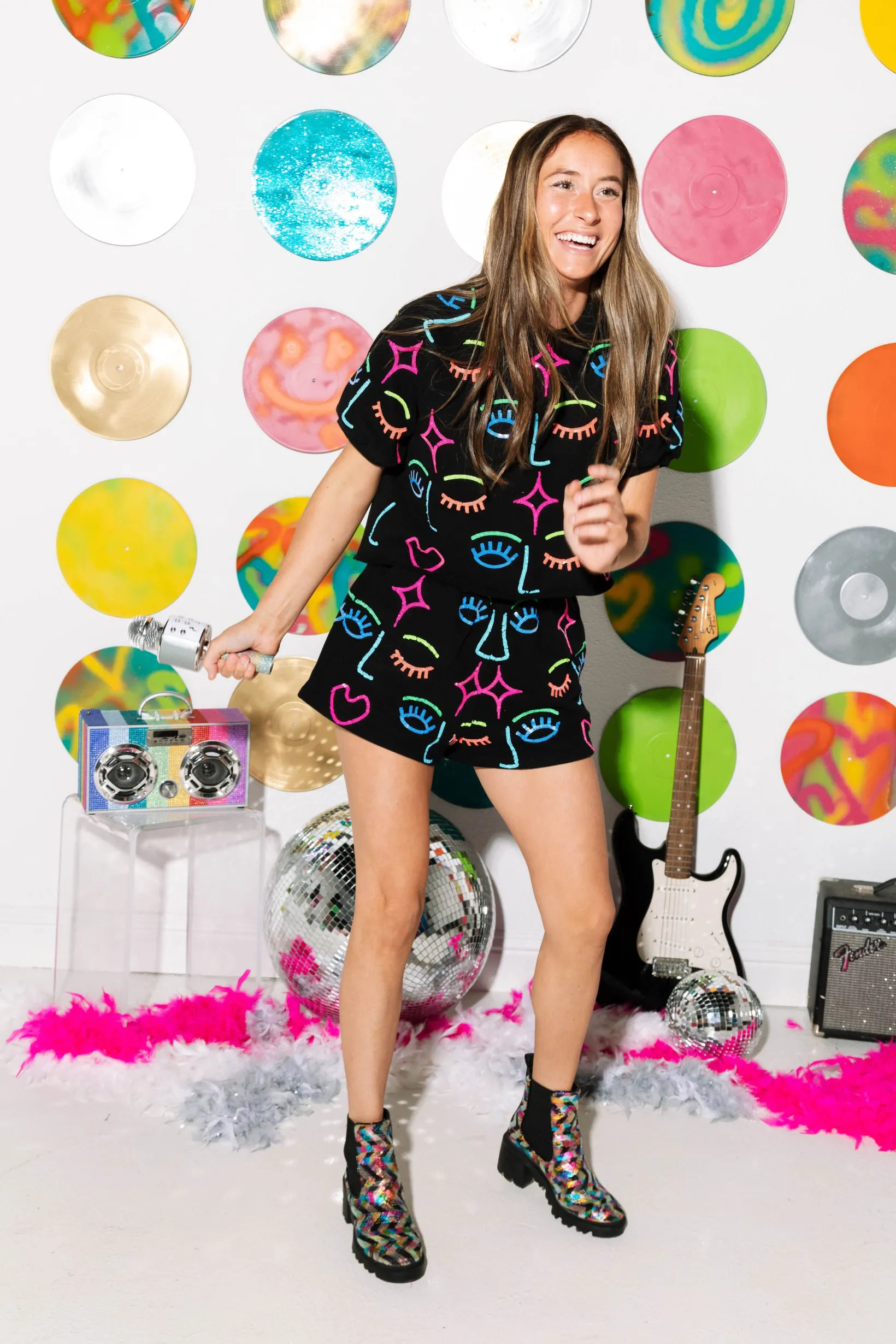 Introducing our Rainbow Faces Short – perfect for lounging or running errands. Made from soft cotton and adorned with sequin rainbow faces all over, these shorts will keep you comfy and stylish all day long. Don’t forget to complete the look with our coordinating top! ! 🌈 🙂