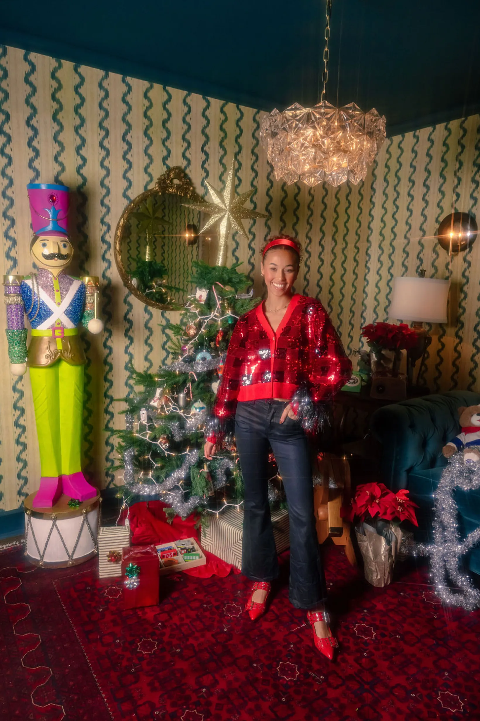 Red & Black Buffalo Plaid Full Sequin With Feather Sleeve Cardigan