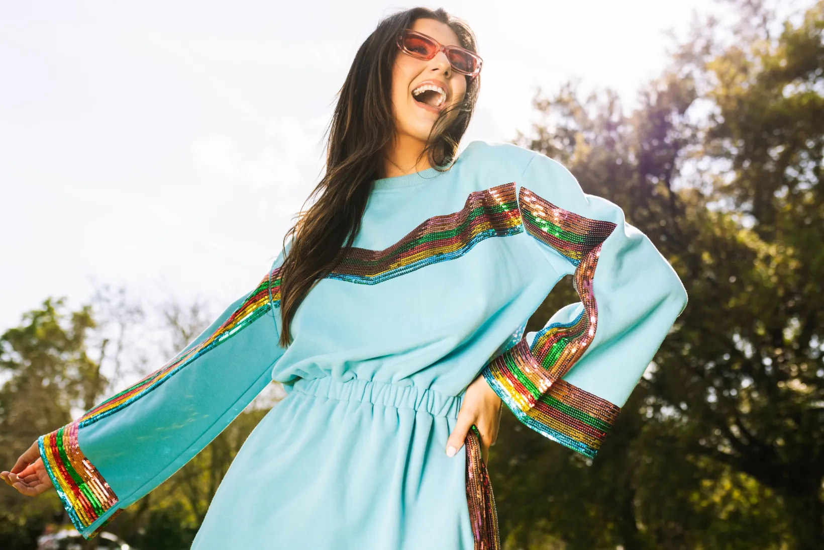 Get ready to turn heads with our Teal Rainbow Sequin Stripe Dress! This ultra-comfortable dress features whimsical bell sleeves and a colorful pop of sequin stripes. The lightweight fabric is perfect for any occasion, and the cinched waist gives you a flattering silhouette. Embrace your playful side with this must-have dress!🦋💚🌷