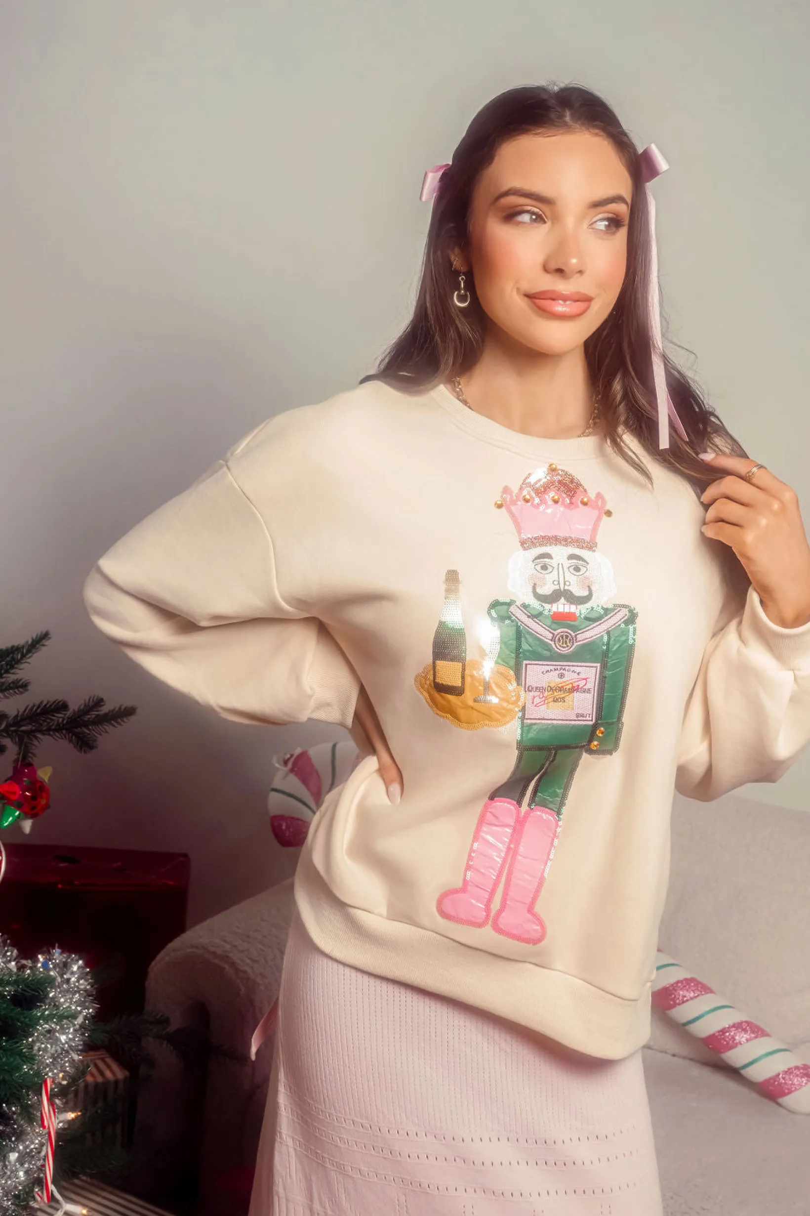 This festive Beige Nutcracker Server Sweatshirt features an oversized design with a sequin nutcracker motif of our classic Queen of Champagne Sweatshirt. Look stylish this holiday season and enjoy the comfort and luxury of this unique piece.