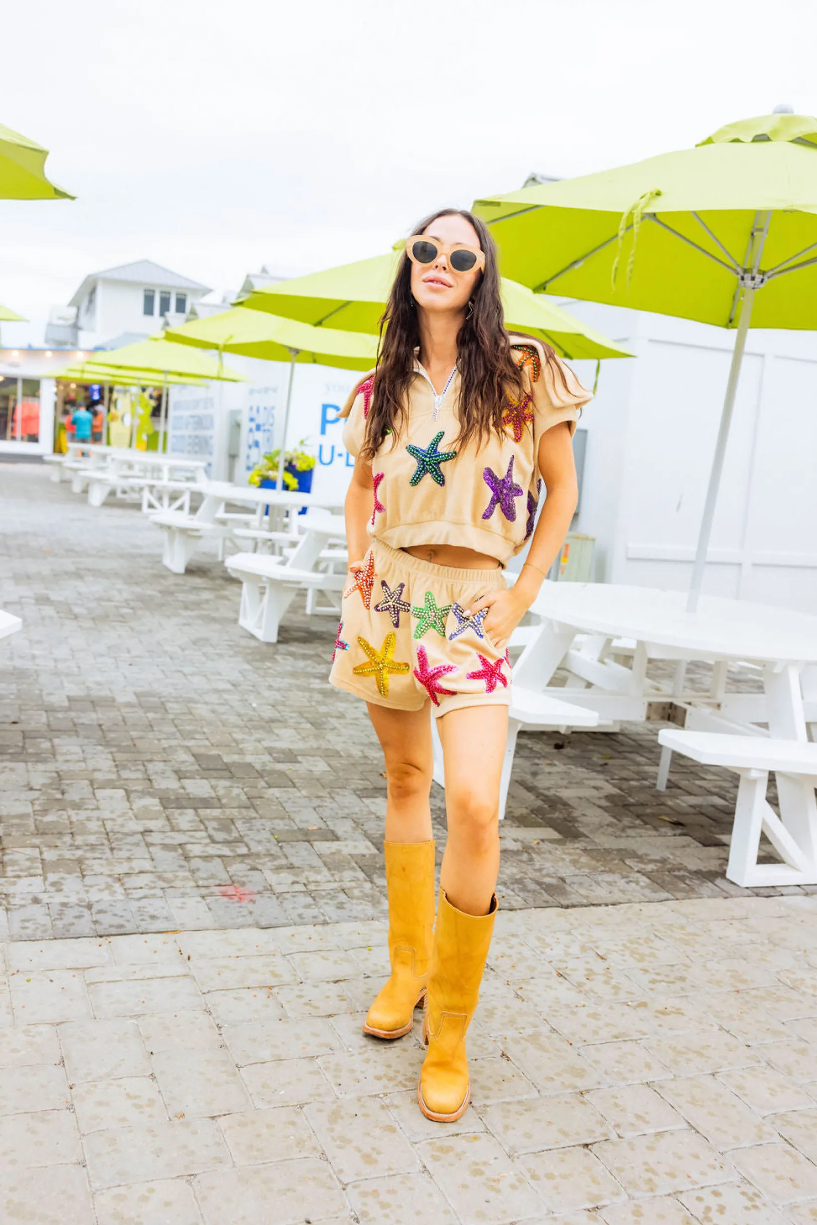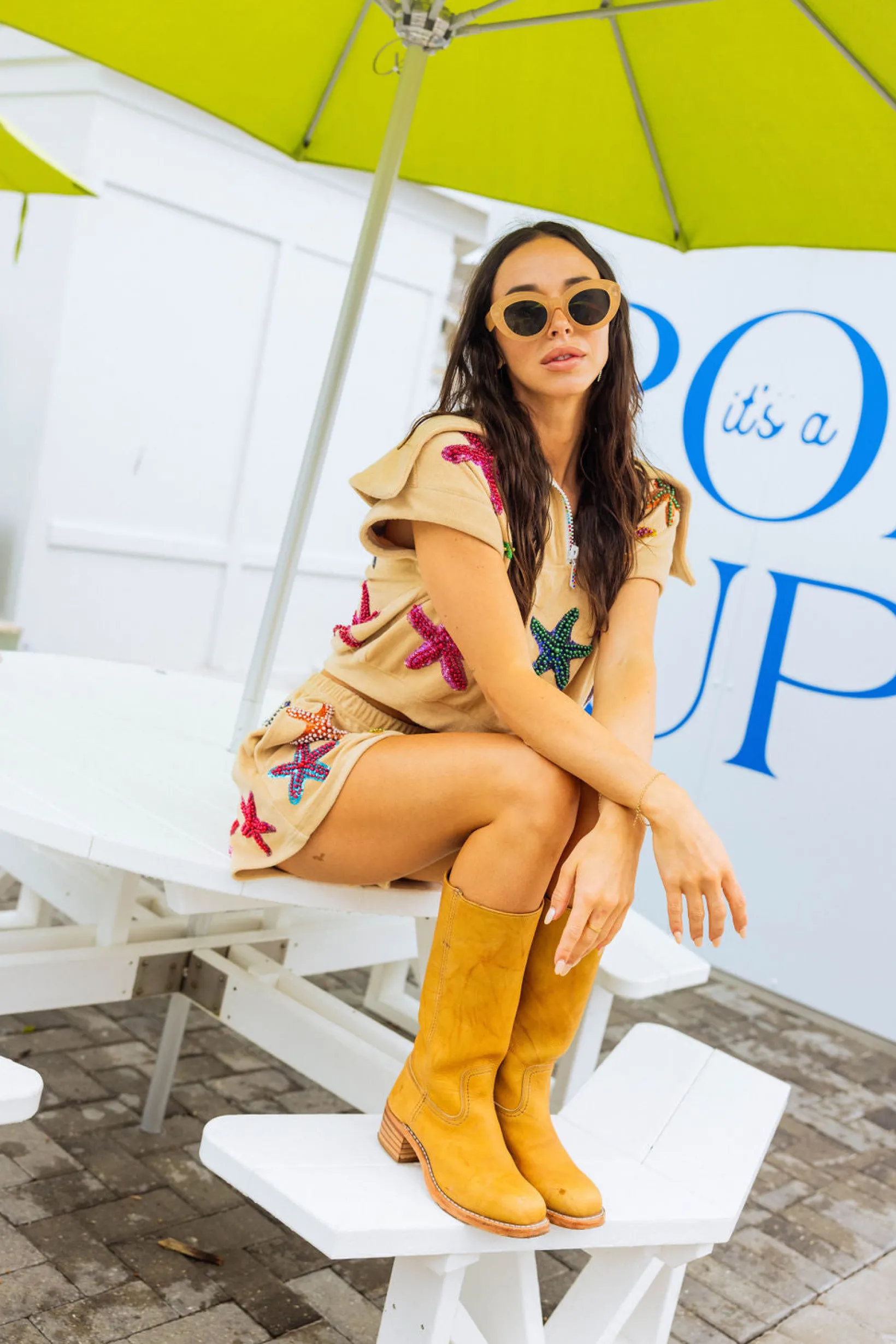 Add some flair to your wardrobe with our collar dress. Complete with a cinched waist and beaded starfish detailing , you’ll be sparkling in no time! Perfect for a day of sand and sun, you’ll be the star of the shore!🏖️🔆