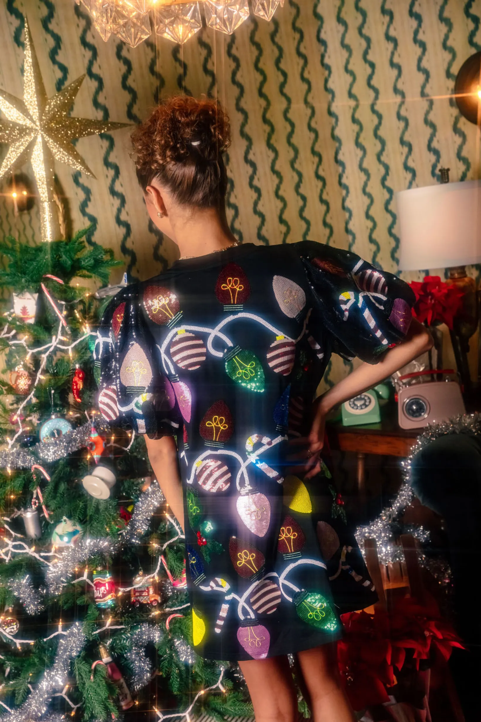 Black Christmas Lights Poof Sequin Sleeve Tee Dress