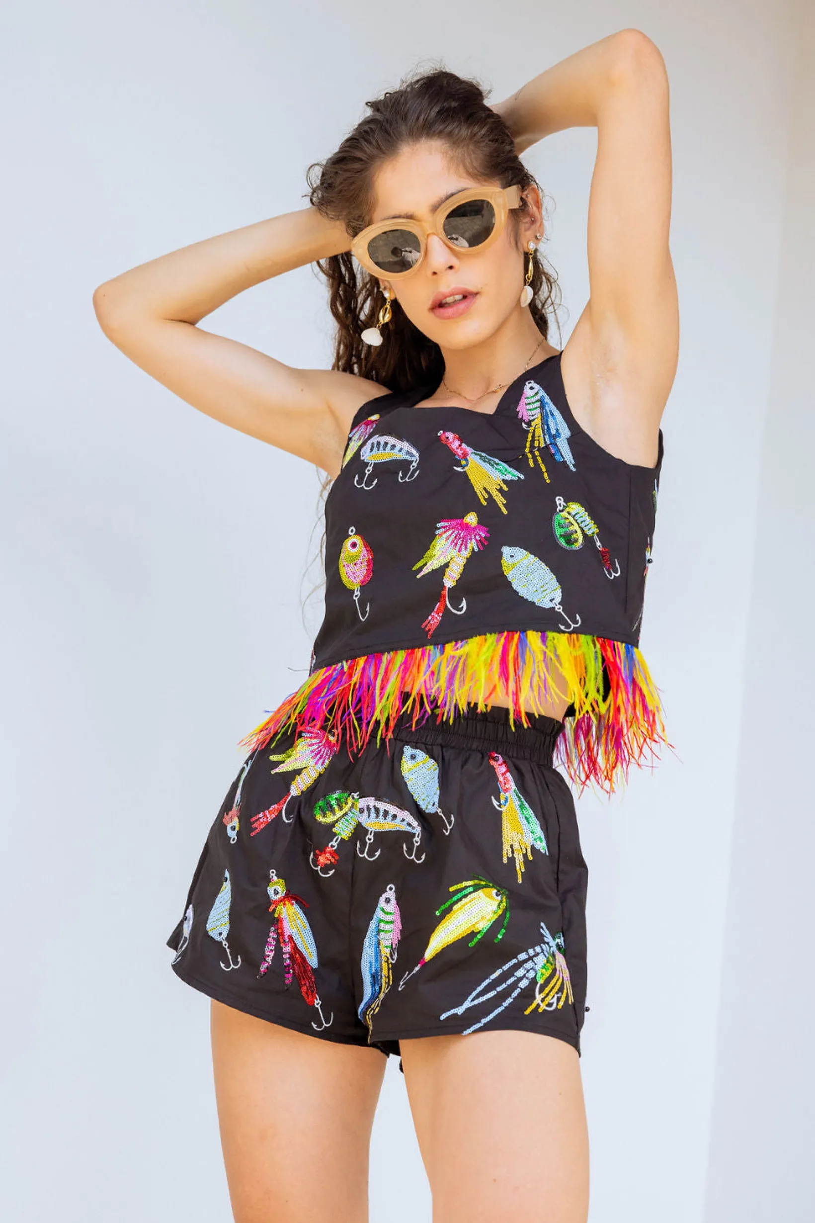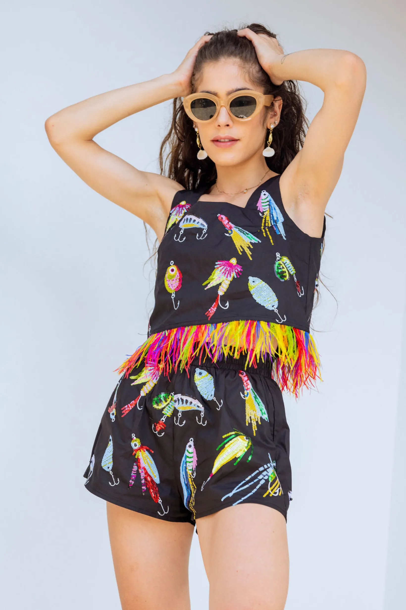 Our cotton shorts have an elasticated waist and feature a sequin fish tackle design. Perfect for a day at the beach or a casual outing, these shorts add a fun and unique touch to any outfit. Reel them in while they’re still available! 🐠🎣