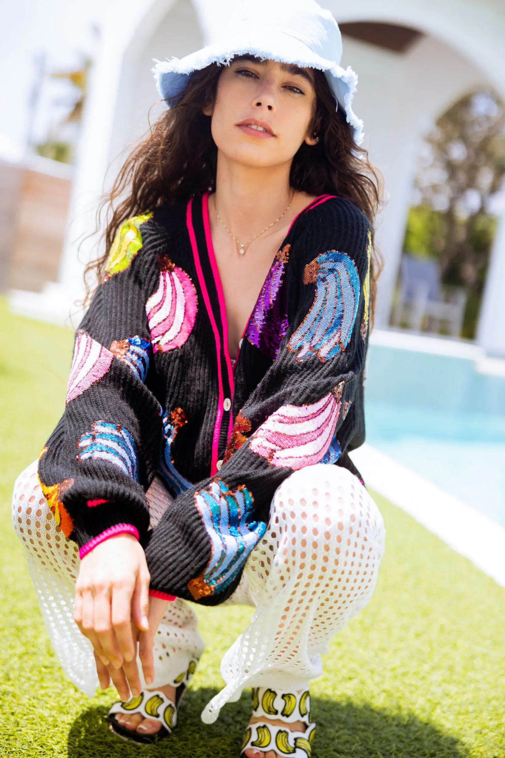 Get ready to go bananas ! Our comfy, cozy cardigan features a sequin banana design. (Warning: may cause sudden cravings for bananas.) 🍌
