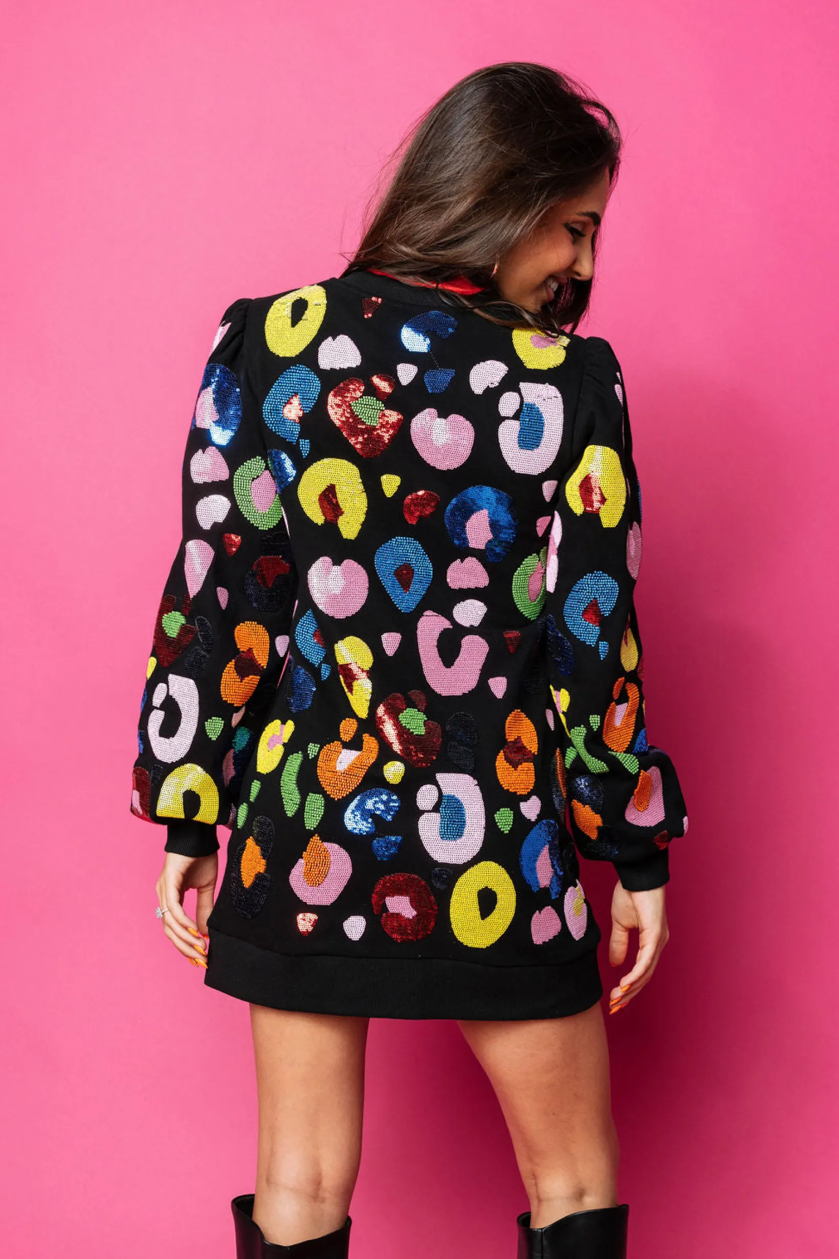 Wake up the wild side in you with our Black Multi Beaded & Sequin Leopard Sweatshirt Dress. This cozy sweatshirt dress features puffy sleeves, colorful leopard patterns, and will effortlessly add a pop of color to your fall wardrobe.