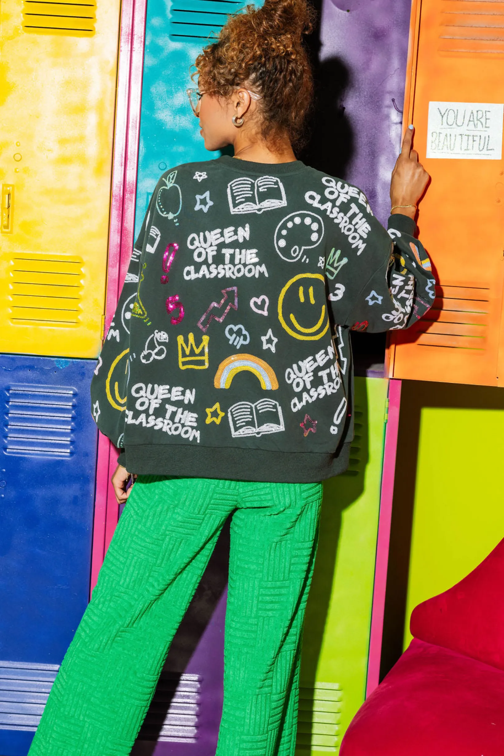 Meet our classic oversized sweatshirt, complete with balloon sleeves and a sequin Queen of the Classroom icon design. Perfect for all teachers who rule their classrooms with style (and a bit of sparkle)!✏️📗