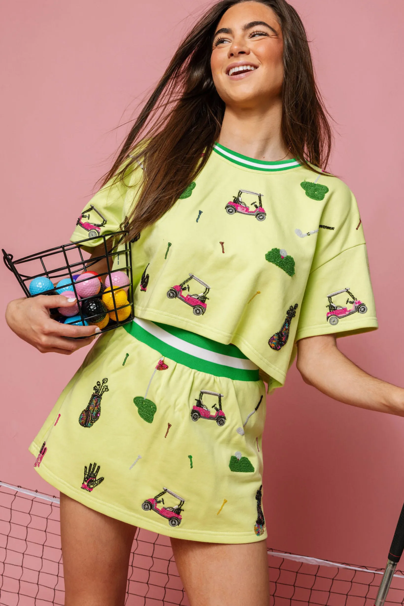 Keep your style on par with our Green Scattered Golf Icon Top! This playful top features trendy stripes on the neckline, a raw-hemmed crop, and a fun golf-themed design. Perfect for a day on the course or a casual outing. Fore-sure you’ll love it! (Sorry, couldn’t resist the golf pun.)⛳️✨