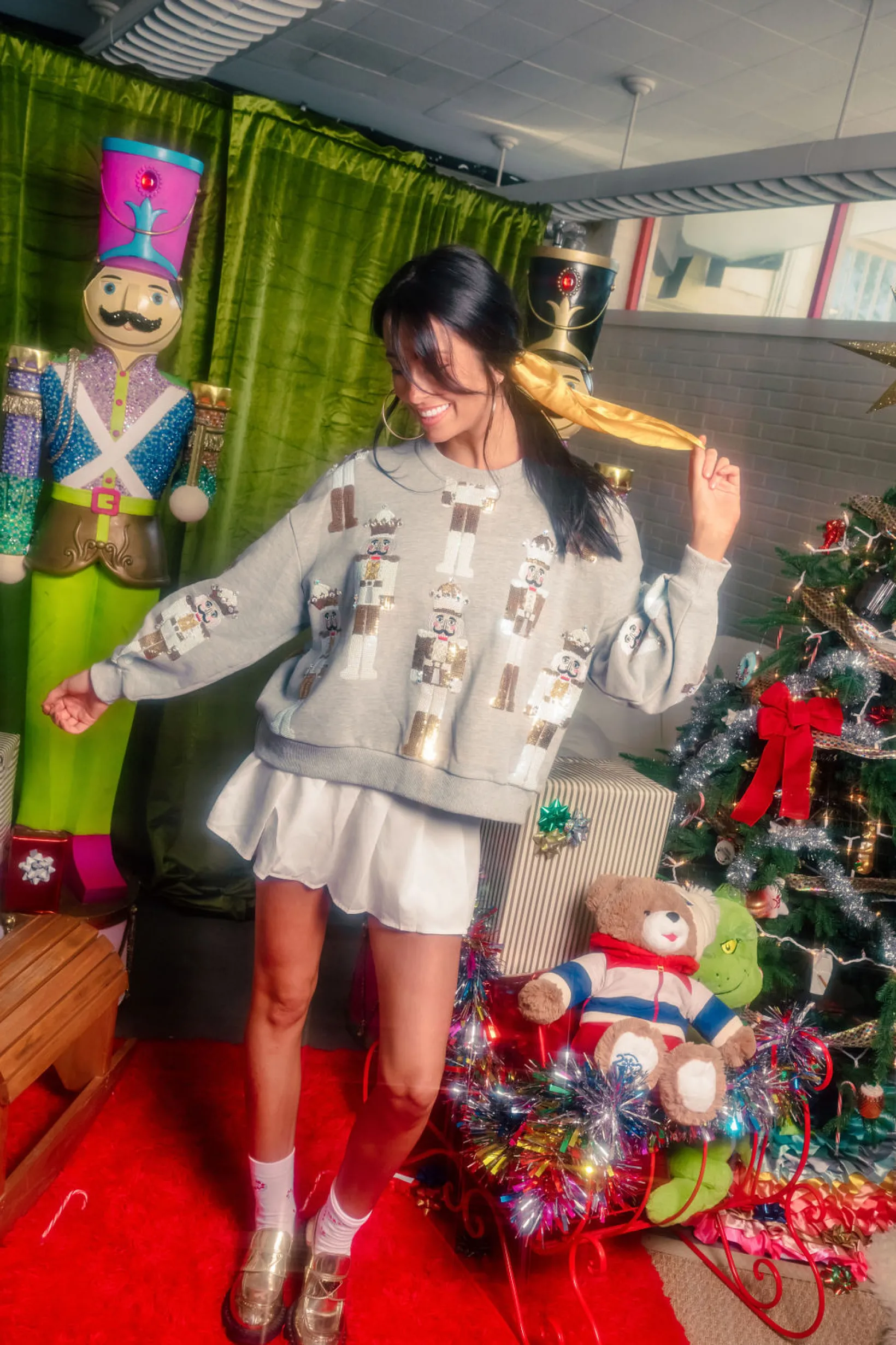 This comfortable sweatshirt is perfect for the holiday season! Its oversized fit with a sequin-scattered nutcracker design and grey and gold color scheme will keep you warm and stylish all winter long.