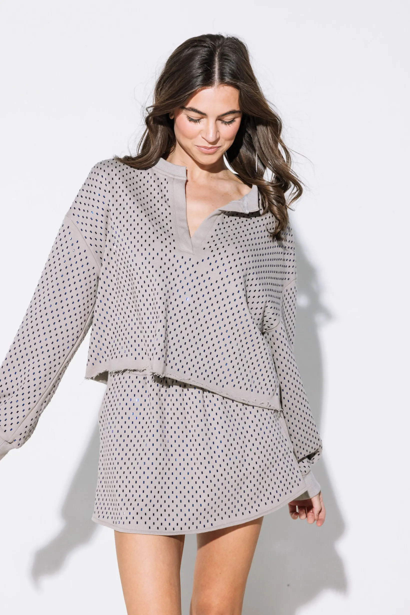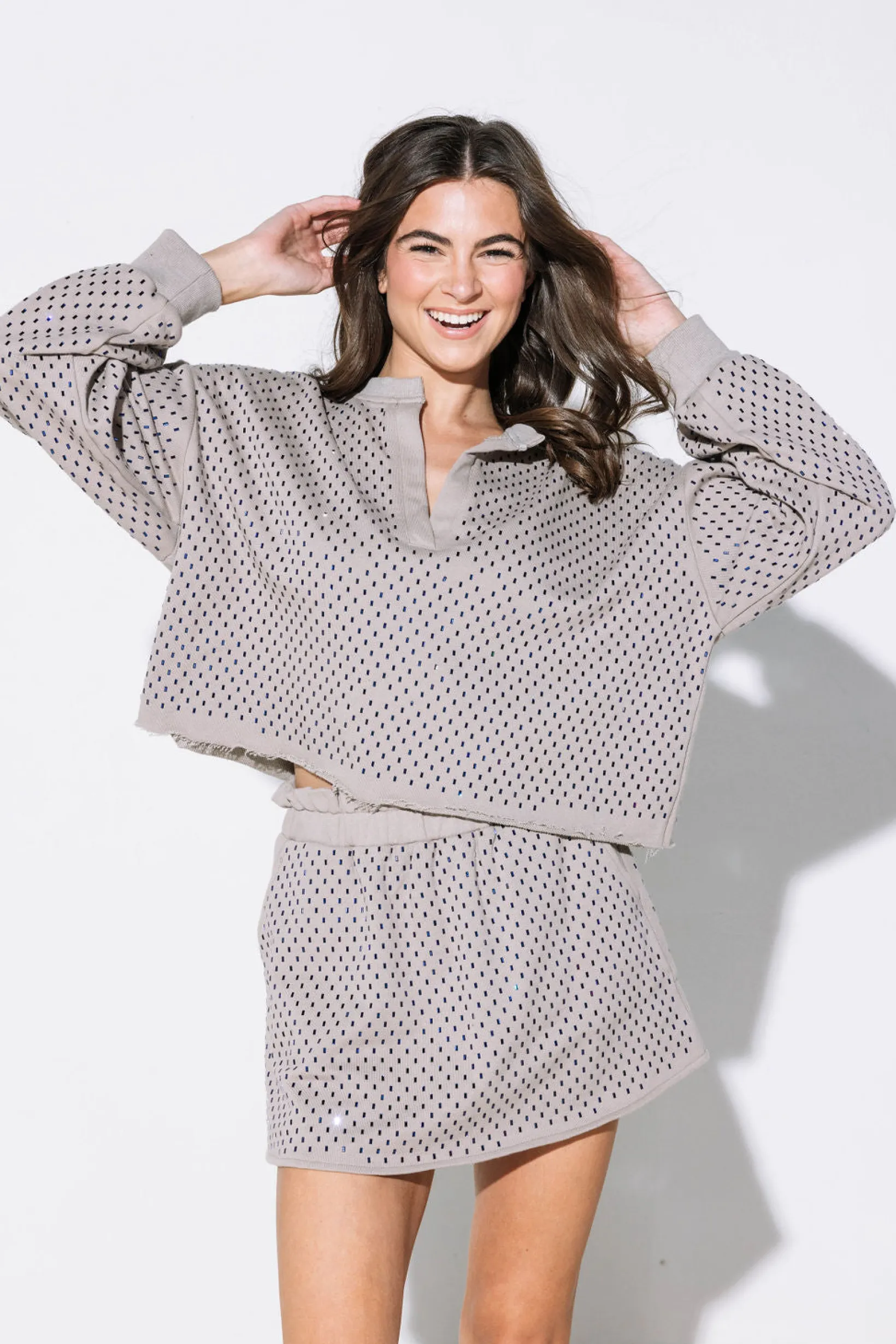 This Grey Scattered Rhinestone Skort is perfect for a modern, elevated look. Its loose, high-waisted fit is complemented with an elegant, fully rhinestone design. Plus, pockets for convenience. Pair with the coordinating sweatshirt to complete the look.
