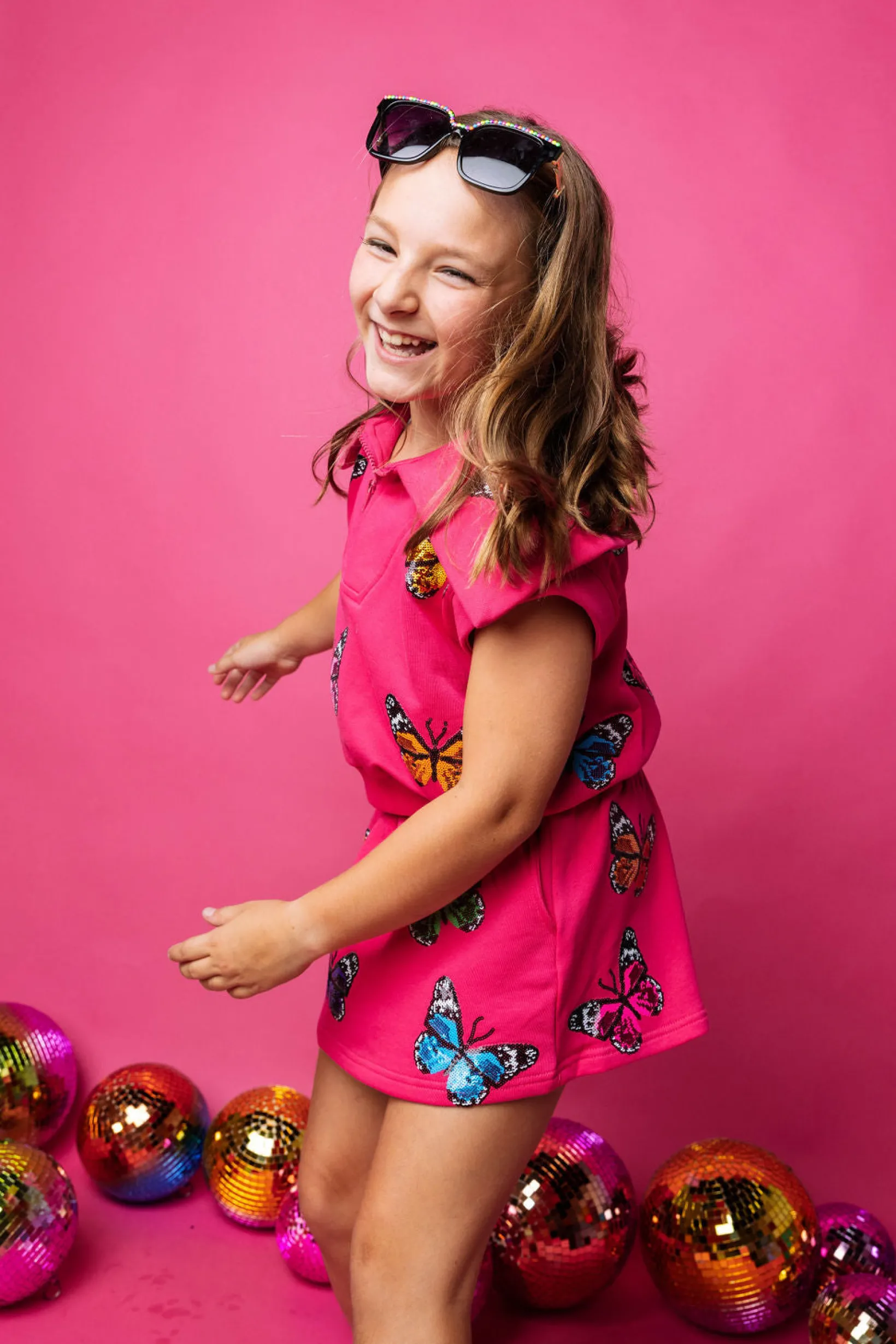 Our collar top is slightly-cropped with a flattering v-neck. Complete with a sequin butterfly design, your little will will never want to take this off. Flutter into fashion with this playful piece!🦋💄