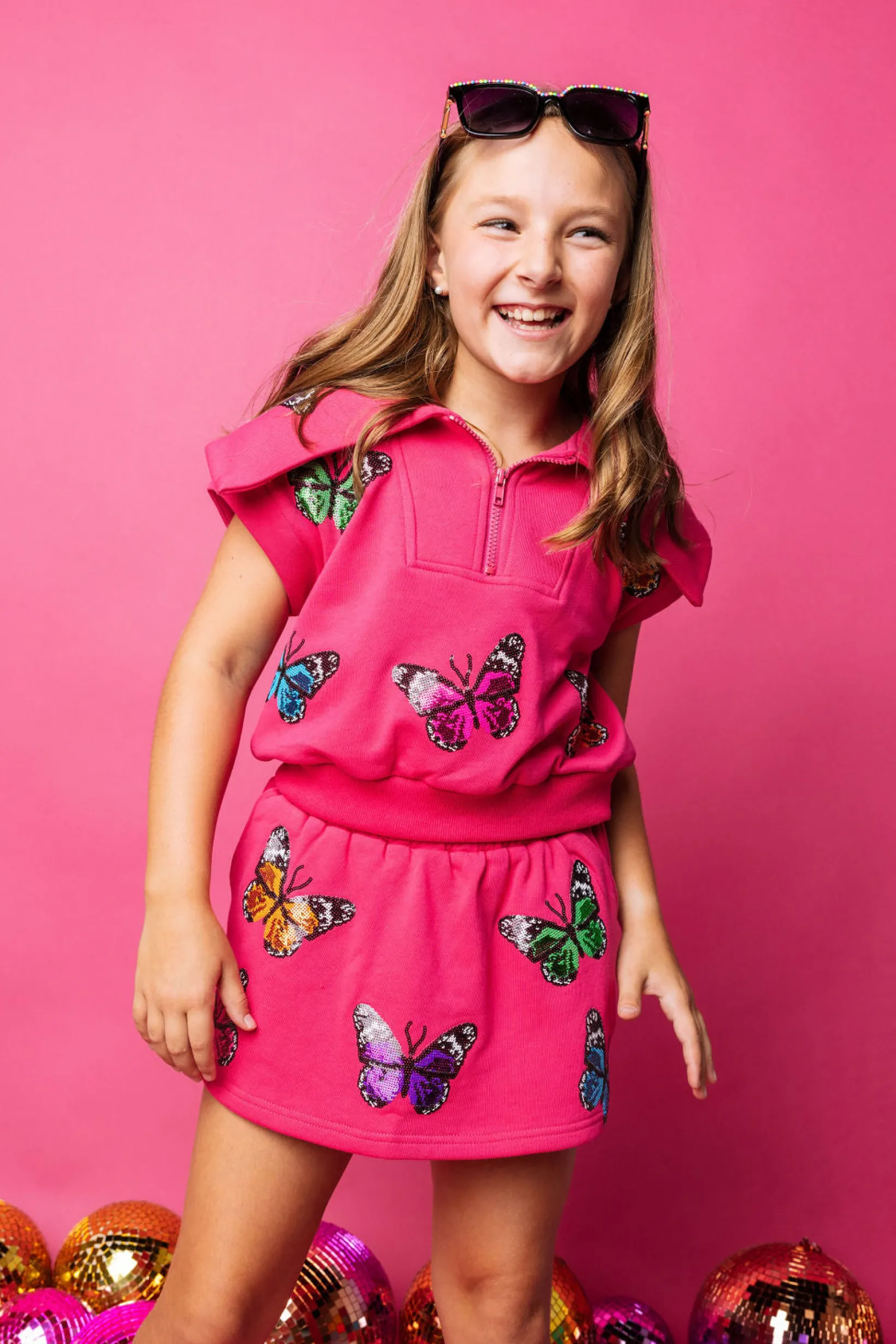 Watch your little one flutter around in style! Meet our classic sweat shorts, now available as a skort! Made from comfy, cozy cotton and bedazzled with a sequin butterfly design, you’ll never want to take this skort off.🦋💄