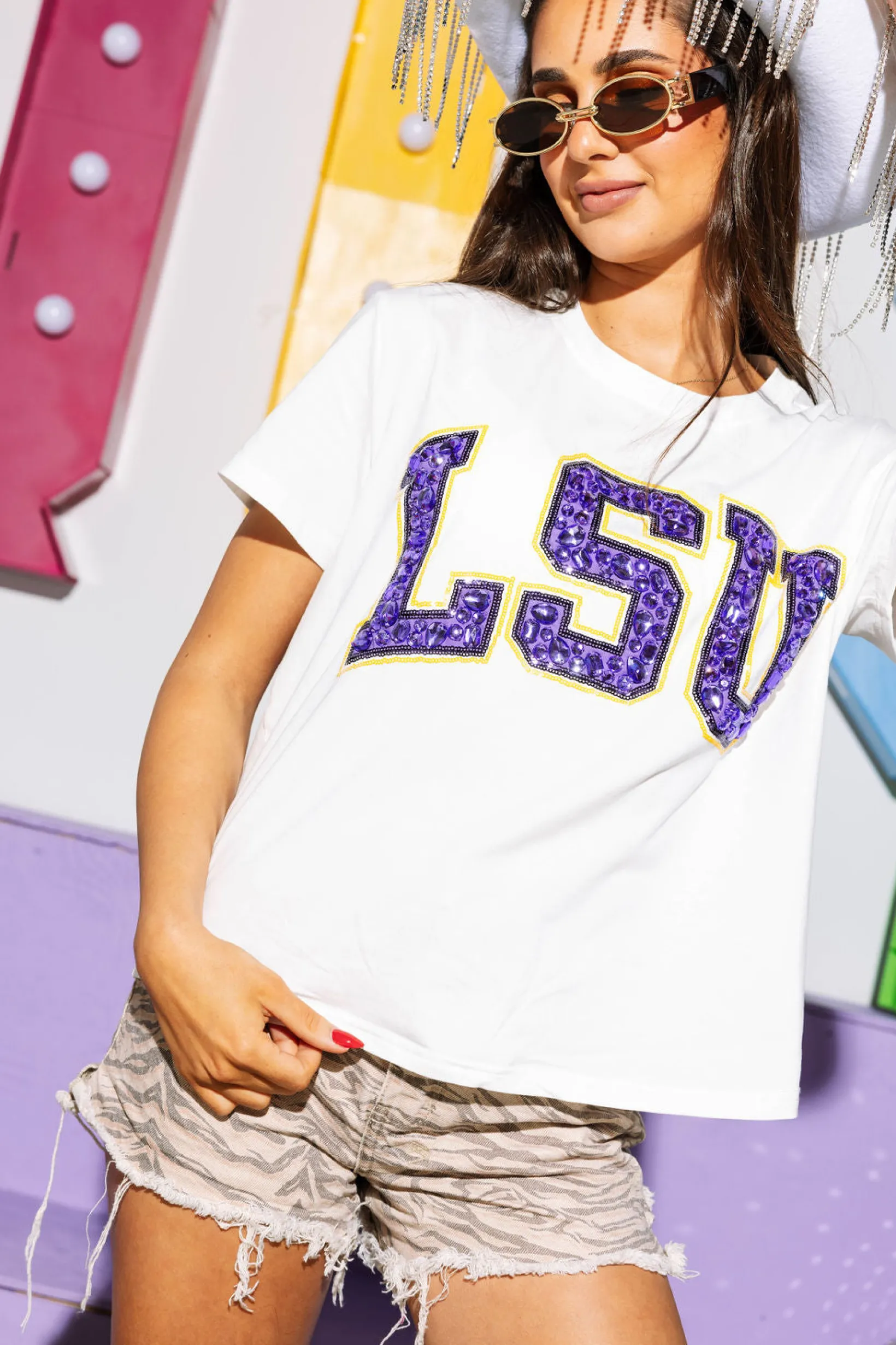 Score a touchdown with this fun and flashy Licensed LSU Jeweled Letter Tee. The sparkling jeweled letters add a touch of charm to your game day wardrobe. Show off your team pride in a playful and stylish way. Geaux Tigers!