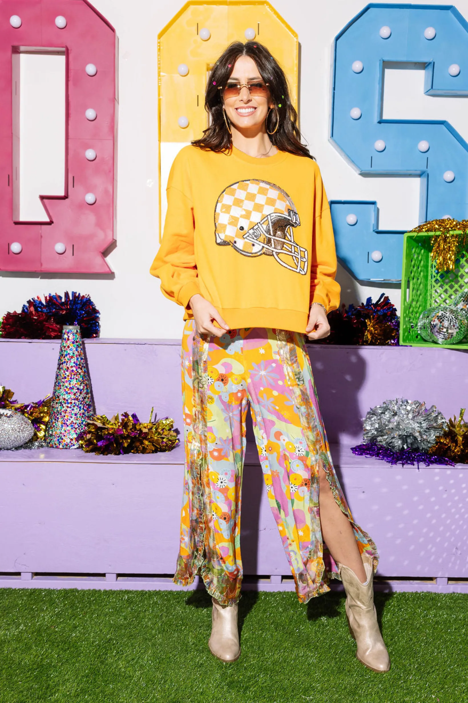 Get ready to root for Tennessee in style with our Licensed Orange Tenn Checkered Helmet Sweatshirt! This sweatshirt is perfect for cooler game days and adds a touch of team spirit with its checkered helmet design. Stay warm and show your support in a fun and playful way. Go Volunteers!