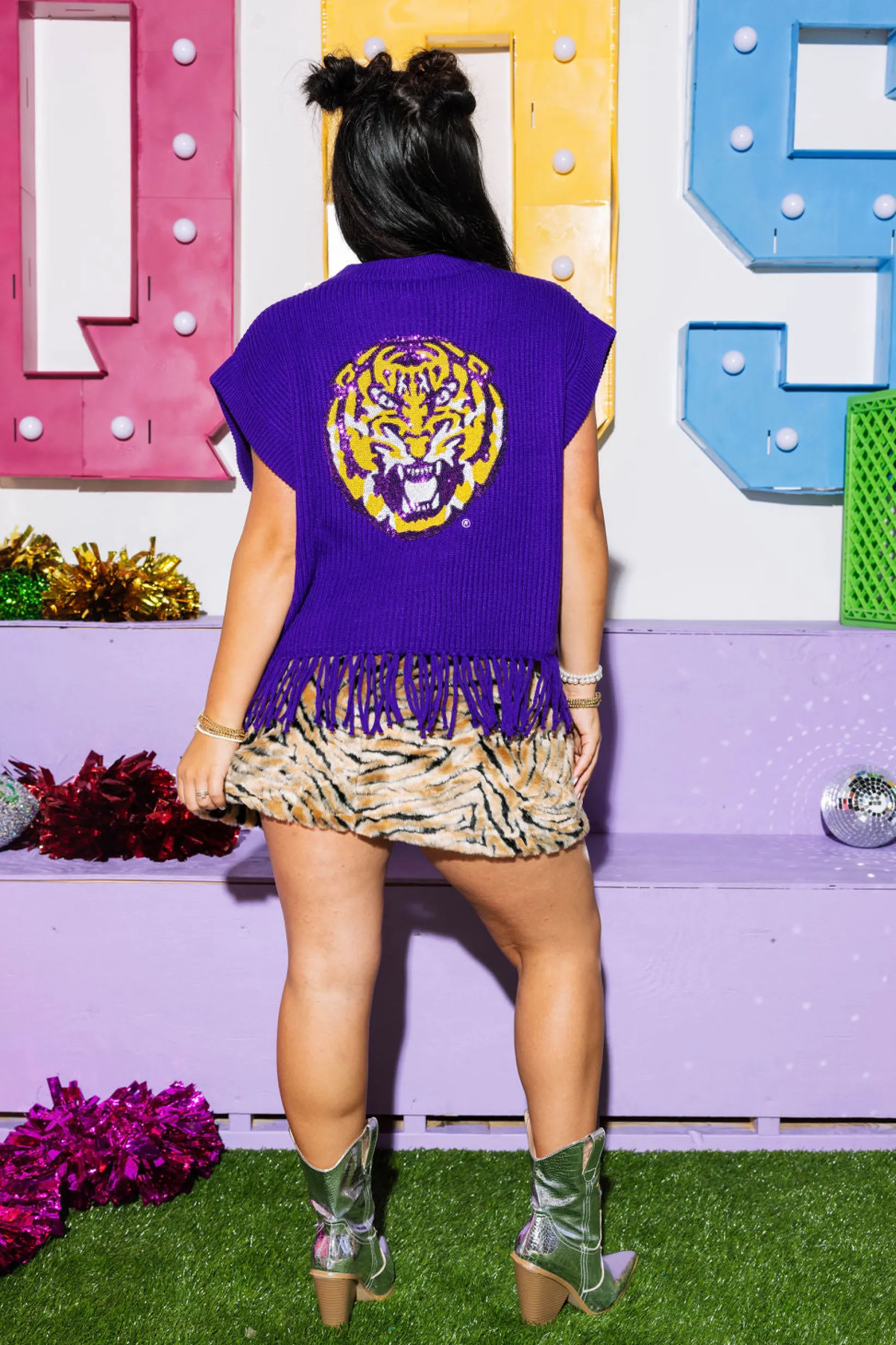 Turn heads on game day with our ‘Geaux Tigers’ Fringe Sweater Vest! This fun and quirky piece features glitter script on the front and a sequined logo on the back. Perfect for showing your team spirit in a stylish and unique way. Go team!