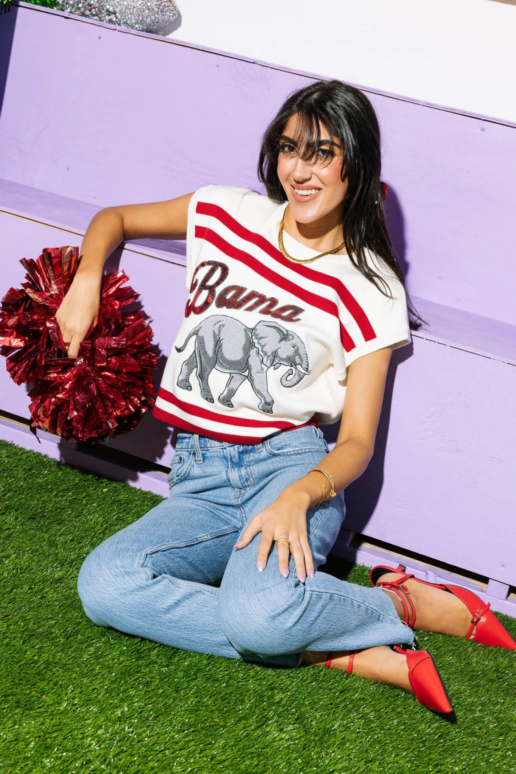 Get ready to cheer on Bama in style with our Licensed White & Crimson Striped Short Sleeve Top! Made from cozy sweater material, this vintage-inspired top offers both comfort and style. Perfect for game day or any casual occasion. Roll Tide!