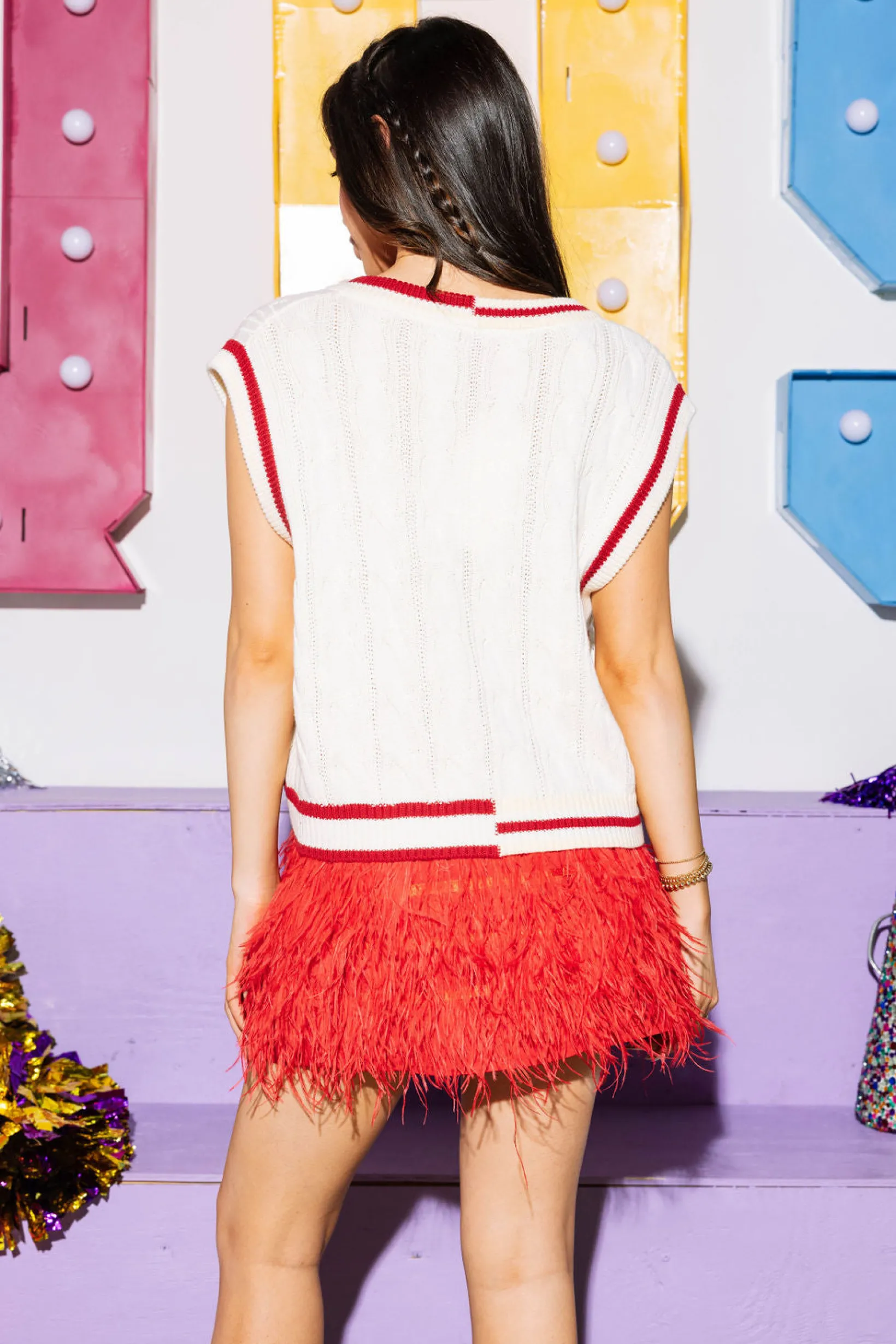 Get ready to show off your school spirit in style with our ‘OU’ V Neck Sweater Vest! With vintage-inspired design and soft cable knit material, you’ll stay both cozy and chic at the game. Plus, the pearl details add a touch of elegance to this fun and quirky piece. Go team!