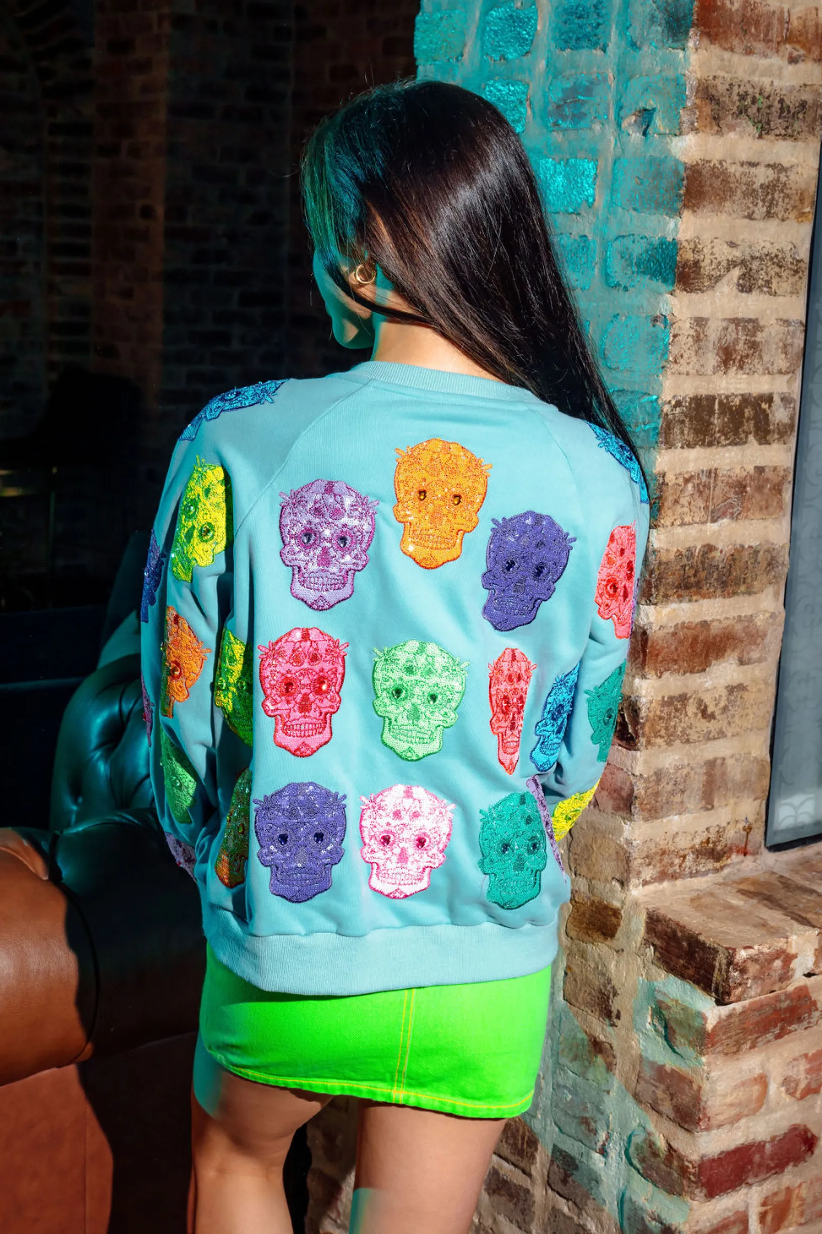 Spice up your Halloween wardrobe with our multi color sugar skull sweatshirt. This unique piece brings a pop of color to any outfit, making it a statement piece for the spooky season. Be the life of the party in this playful and quirky sweatshirt! Pair with matching jogger for the complete look.