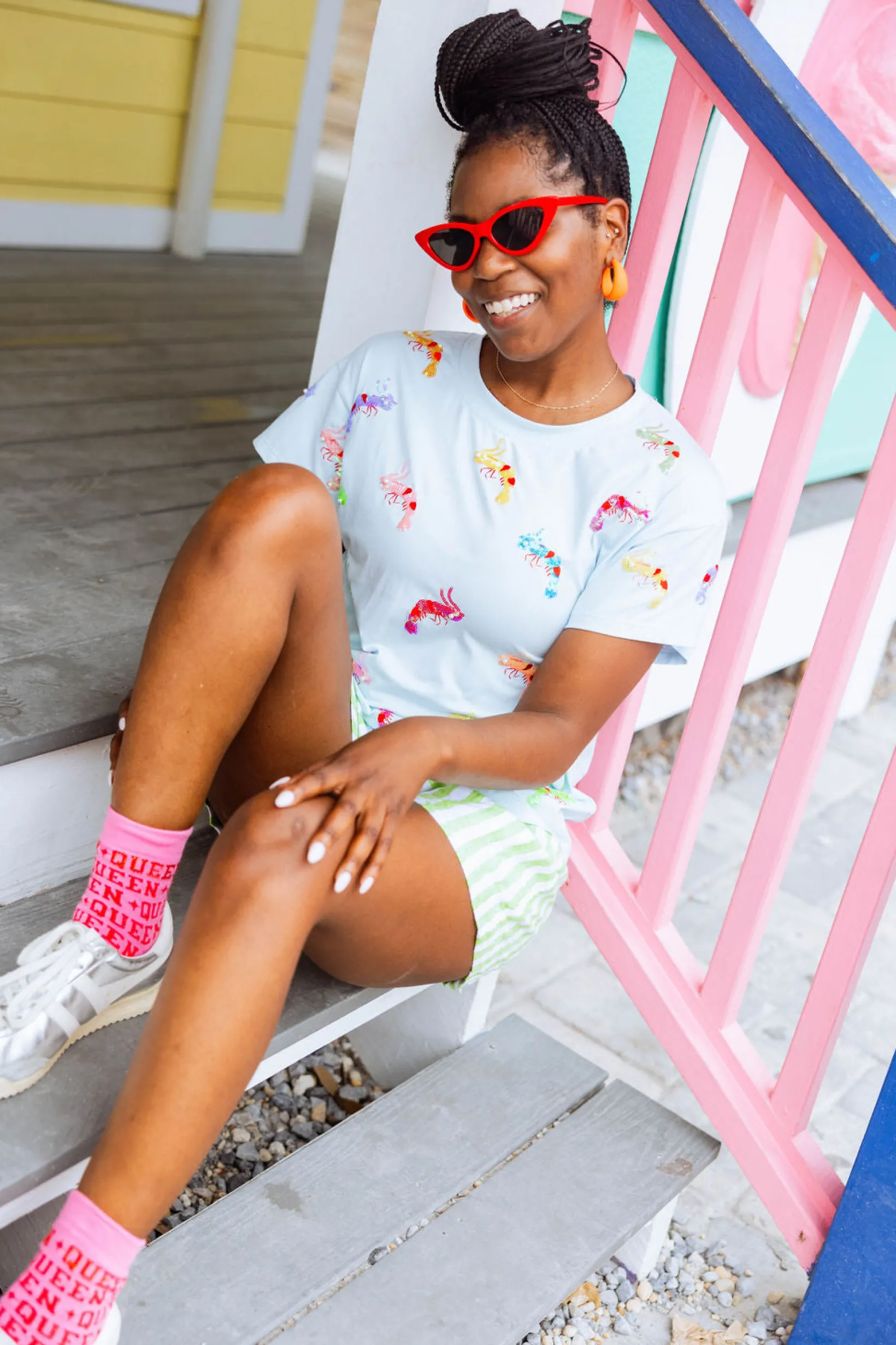 Meet our classic tee, complete with a sequin shrimp design. This tee is the catch of the day!🦐🔆