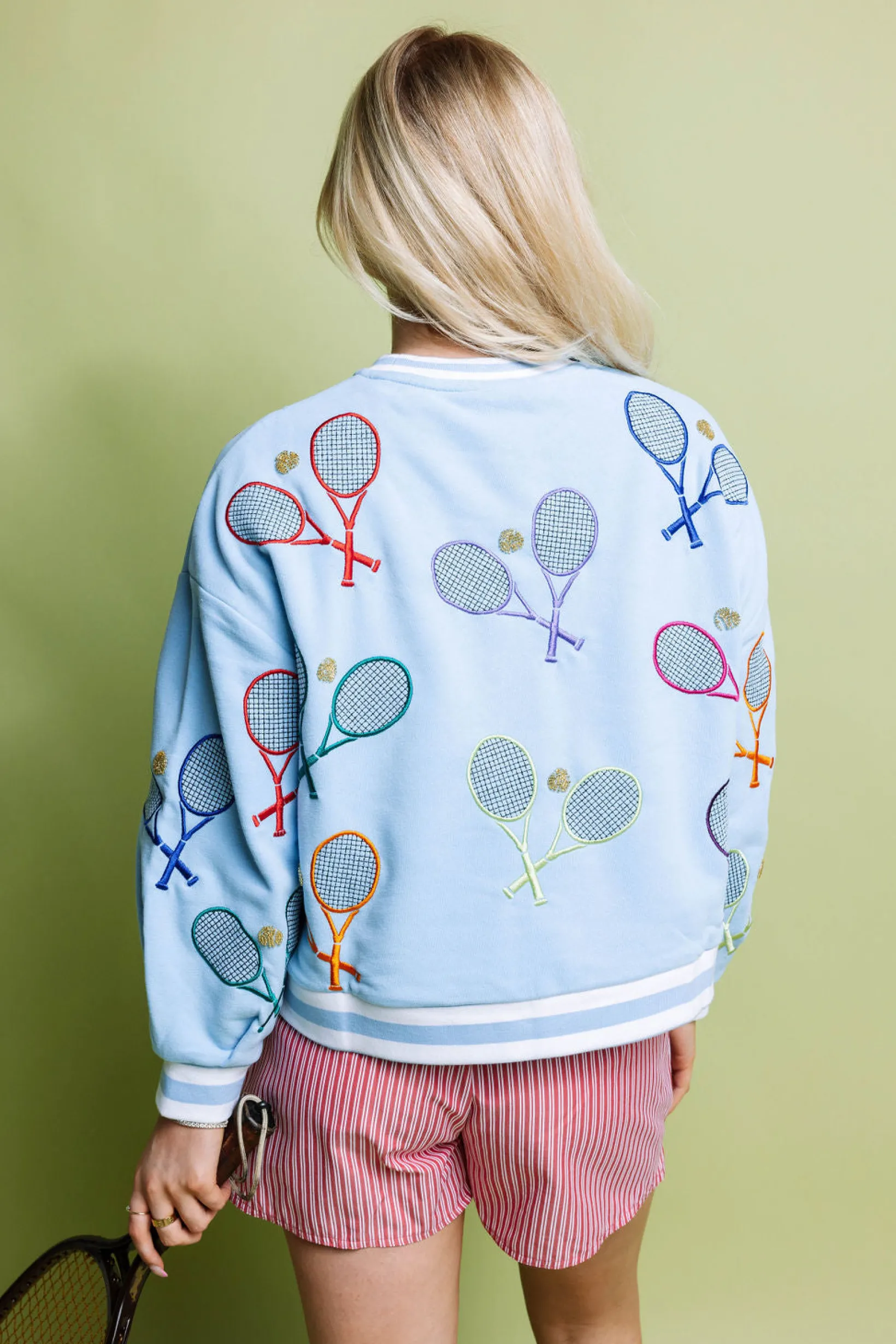 Serve up some style with this playful sweatshirt featuring striped accents and a sequin tennis racket design. Our classic sweatshirt with a boho twist, this long sleeve top features a balloon sleeve with an extra roomy fit. Not your average sweatshirt, this one is sure to make a statement!(Tennis pun intended 😉)