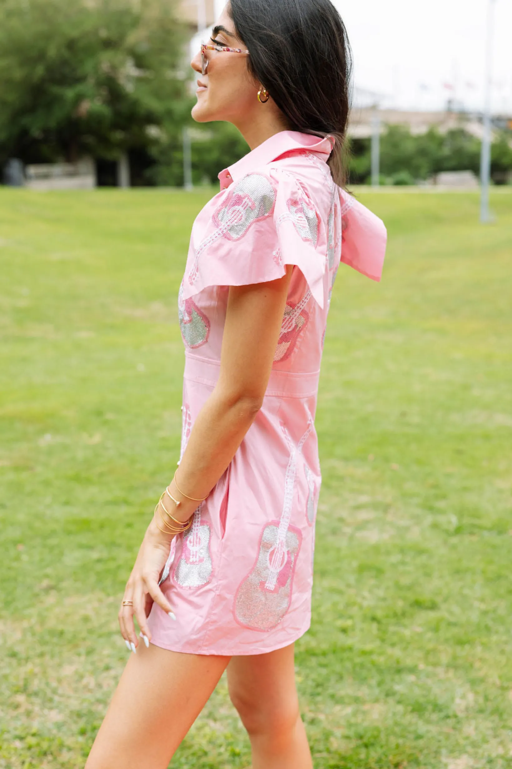Strum the fashion chords with our collared dress. Complete with a cinched waist, sequin guitar design, and flared sleeves, you’ll be sparkling in no time! ✨🎸
