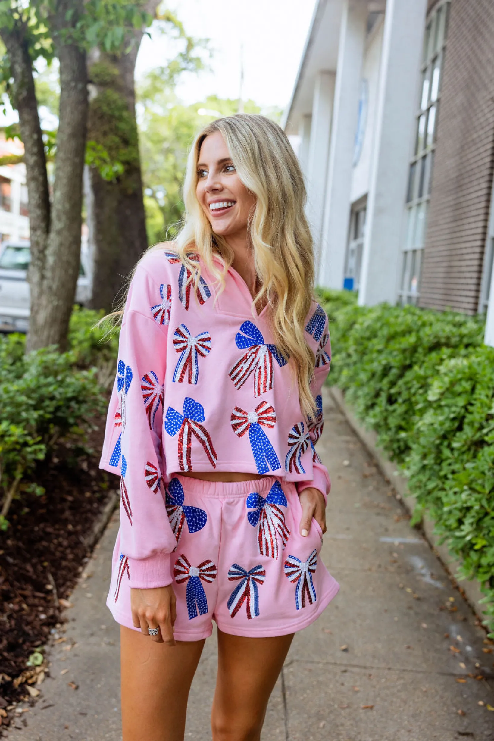 Get ready to show your American pride! Our collar sweatshirt is slightly-cropped with a flattering v-neck and complete with a sequin USA-themed bow. Be sure to style with the matching shorts! ππΊπΈ