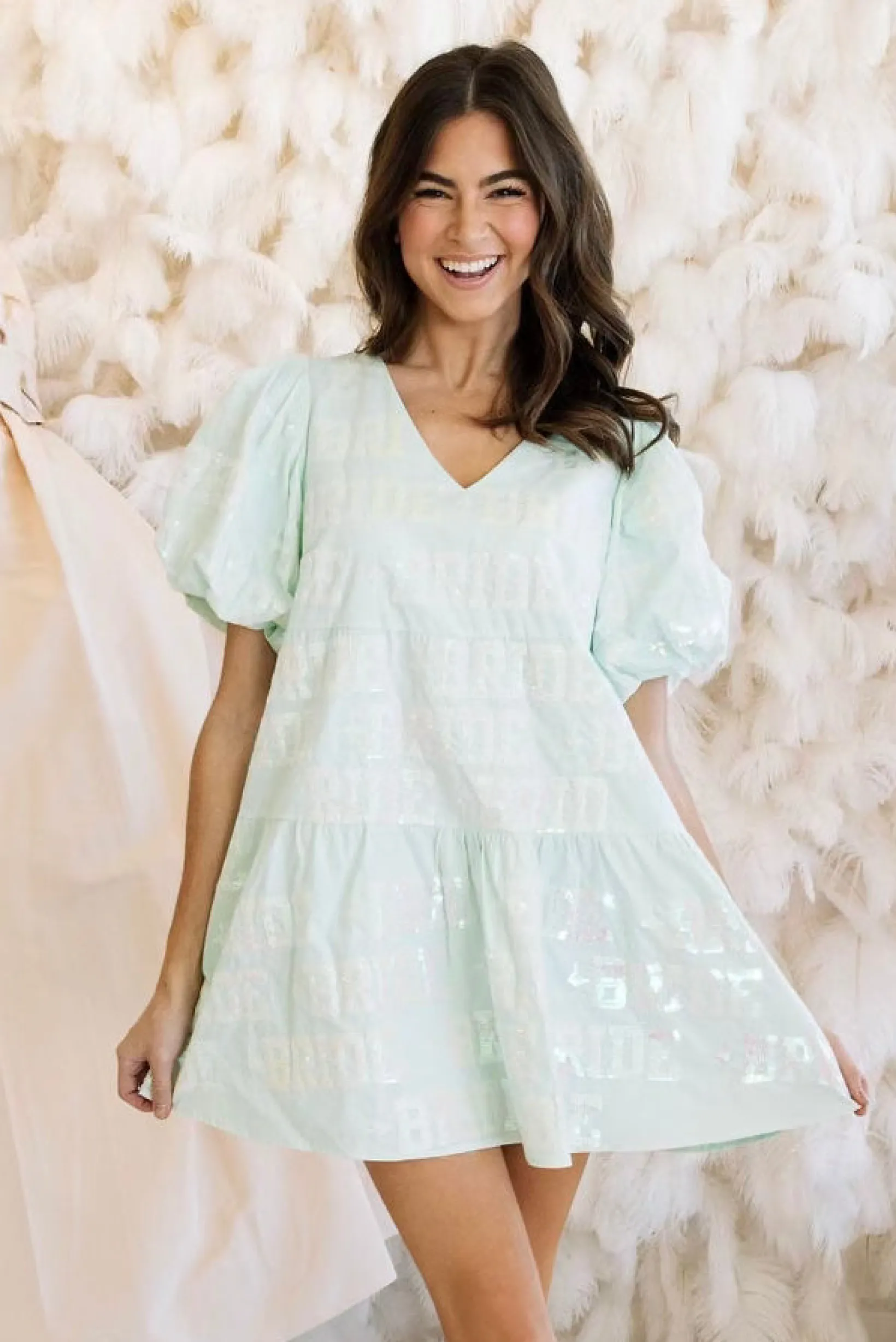 Our tiered poof sleeve dress features a v-neck, poof sleeves in a cotton fabric, and a sequin bride designSay “I do” to this must-have dress. 💍🩵