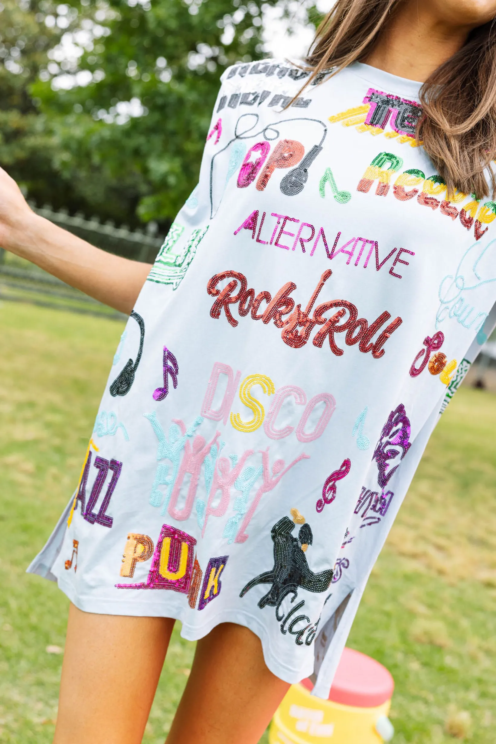 Get ready to jam out in style! Our classic t-shirt, now in a dress. The tee dress is light-weight and loose fitting, complete with a sequin all-over design and shoulder pad detailing. (Note: May cause the urge to dance in public.) 🎧✨