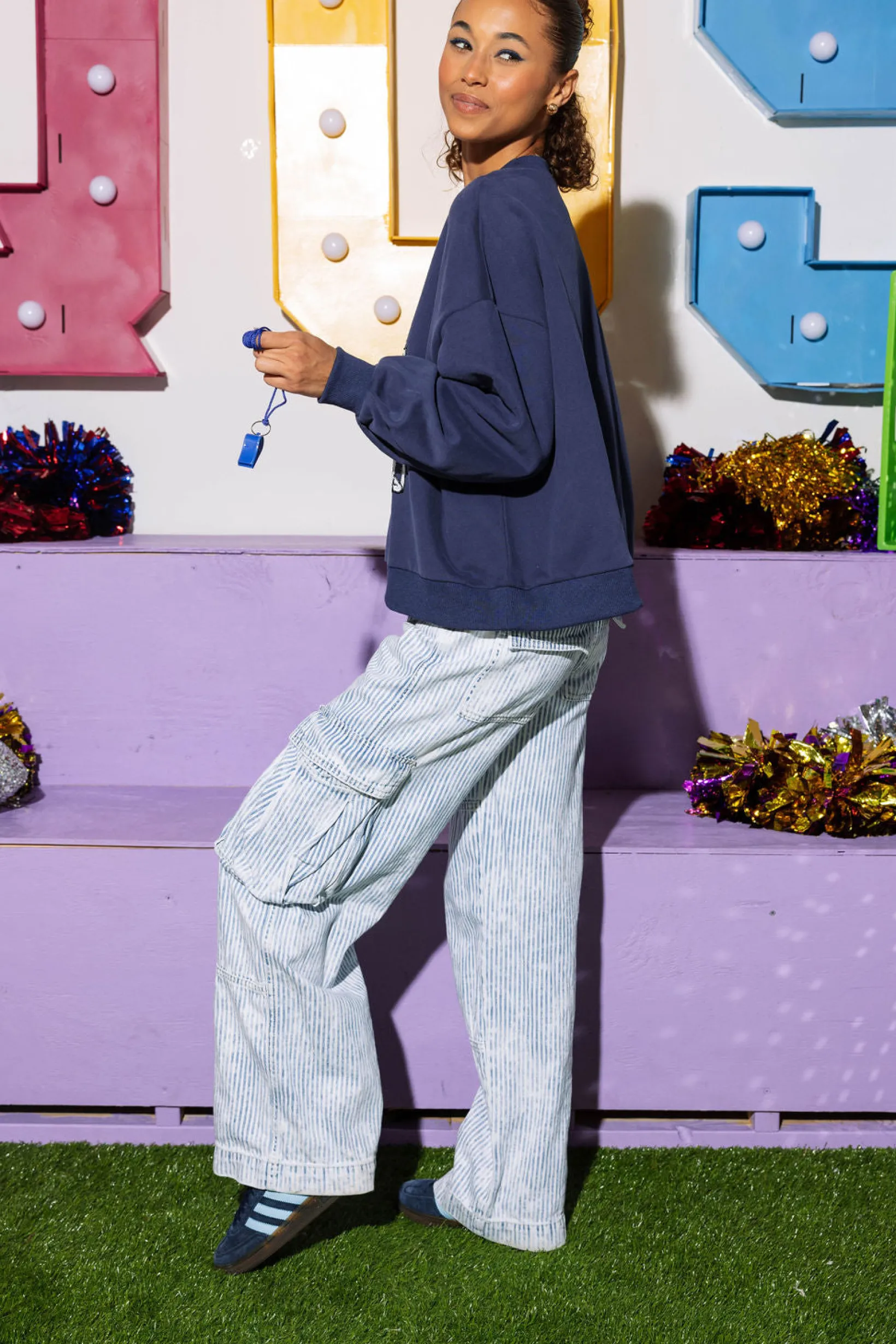 Take your game day look to the next level with this Navy Tiger Print Football Helmet Sweatshirt! This unique sweatshirt features a navy football helmet embellished with sequin tiger stripes on the inside, making it the perfect choice for cooler game days. Stand out from the crowd and show off your team spirit in style!