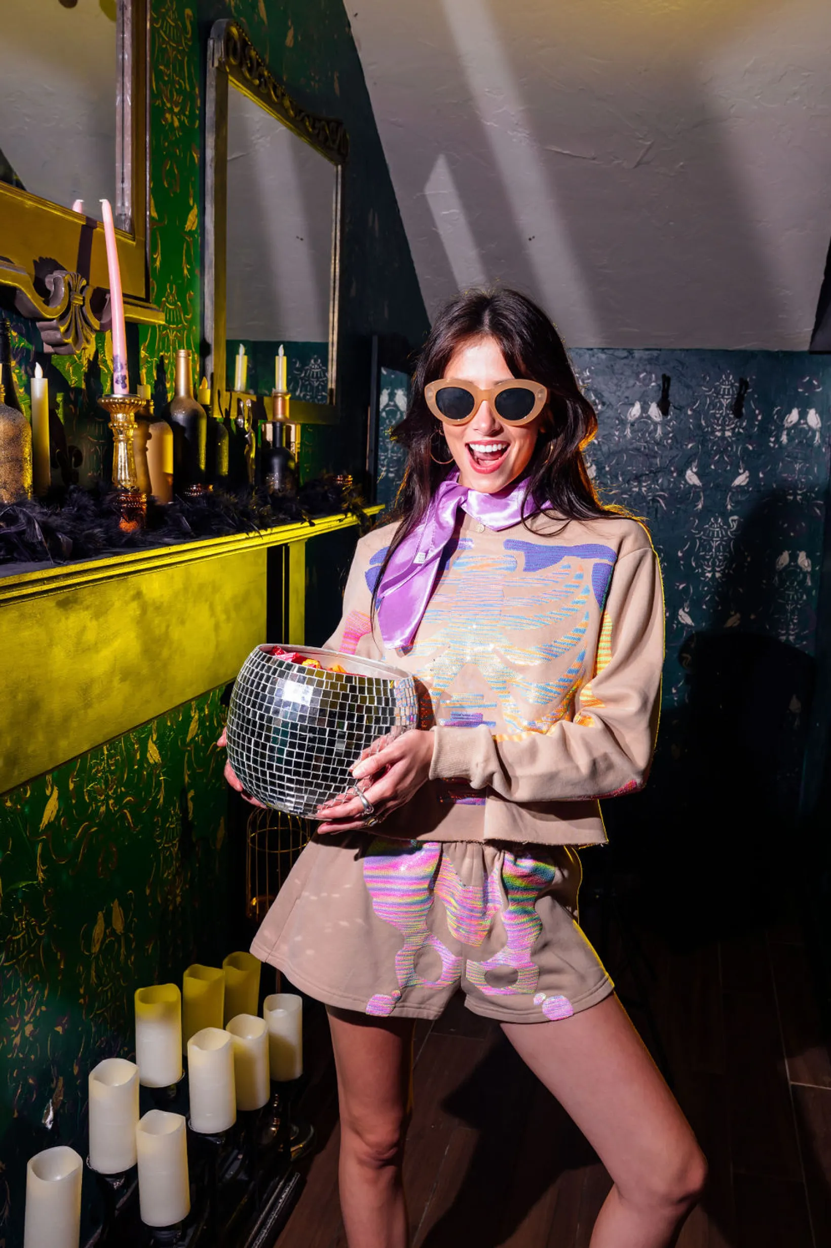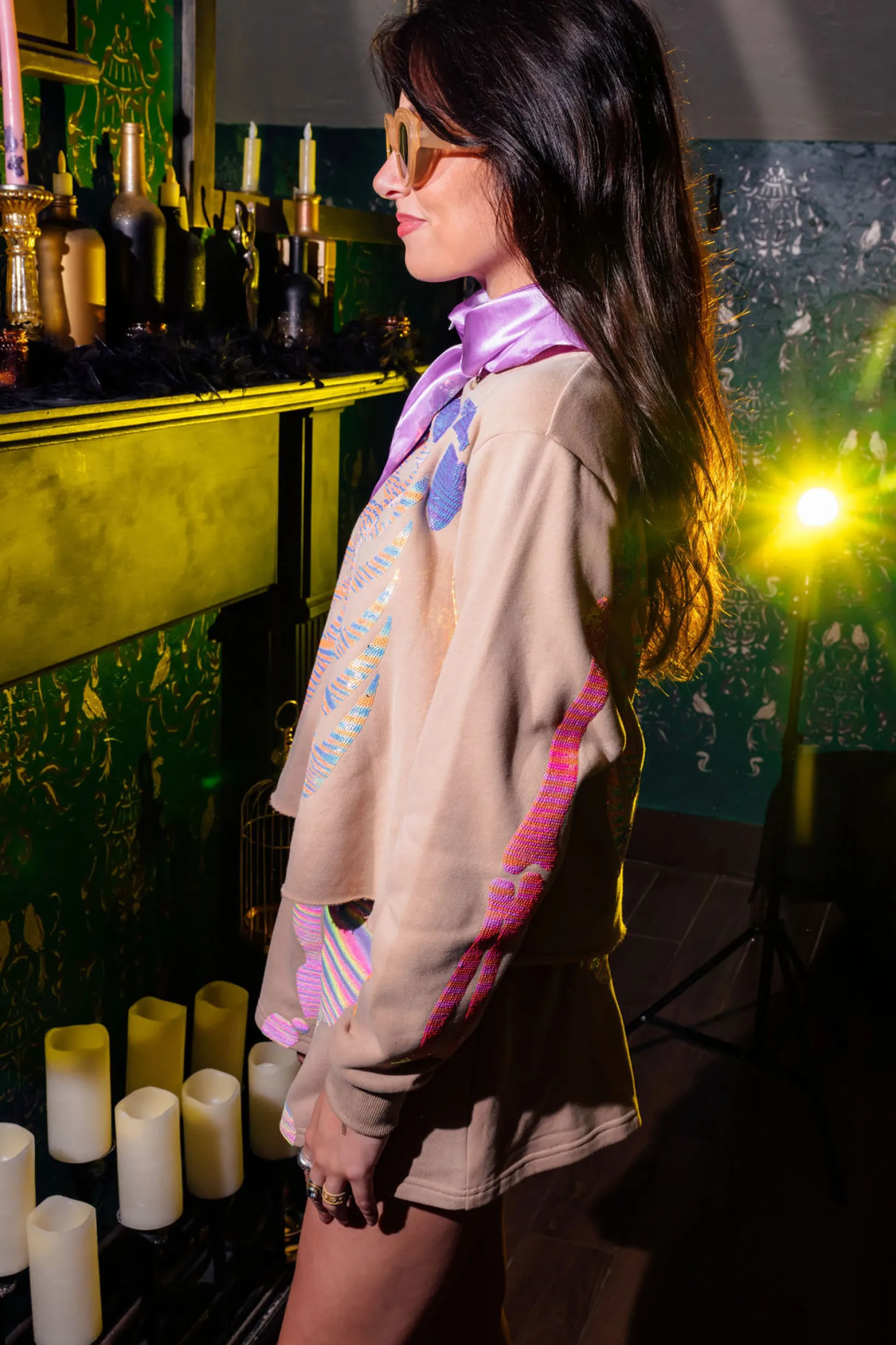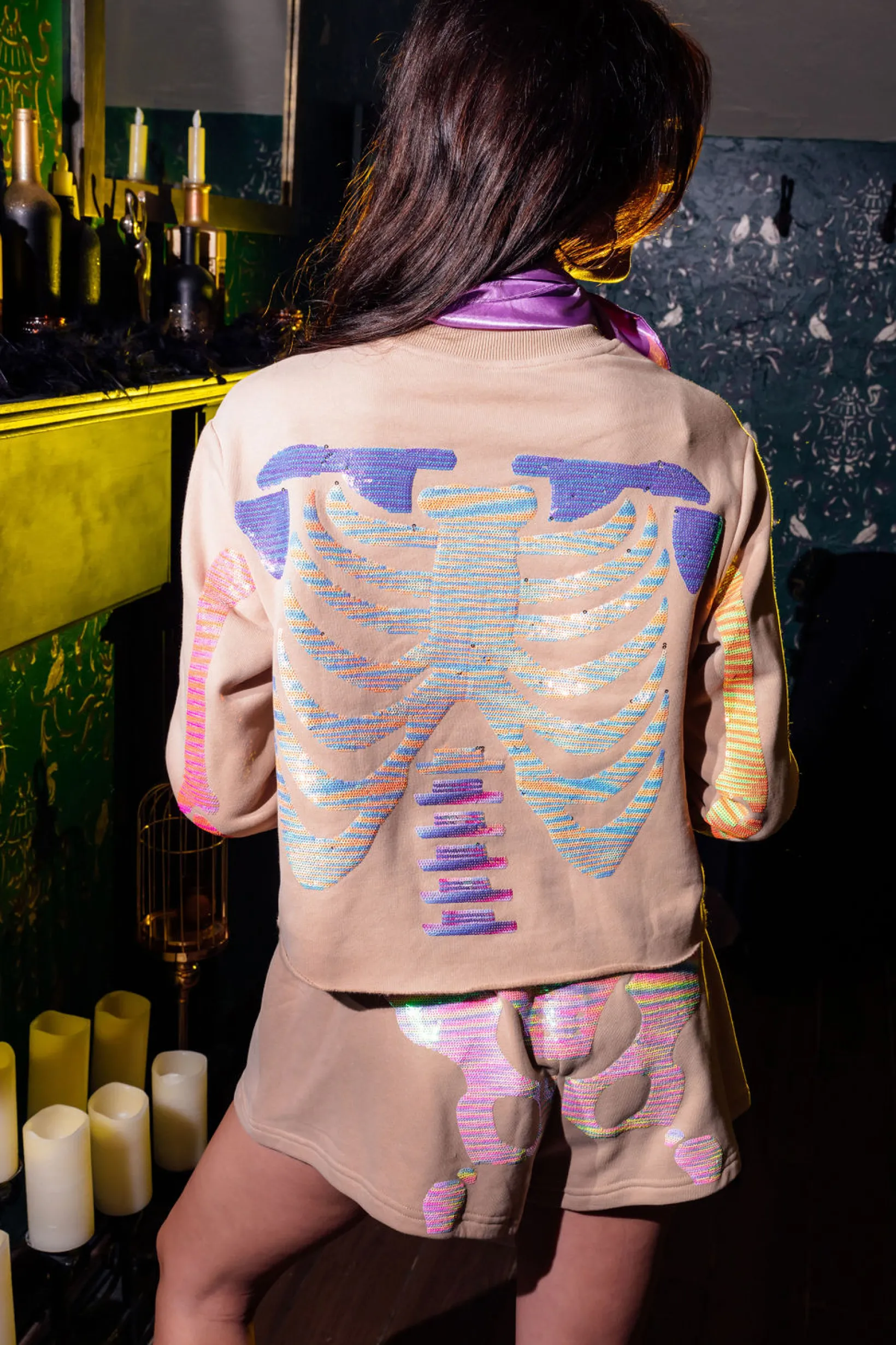 Get spooky and stylish with our Nude Multi Skeleton Shorts. These neutral shorts features a sequin skeleton design on the front and back, perfect for a unique Halloween outfit. Don’t forget to pair it with our matching sweatshirt for a complete and eye-catching look.