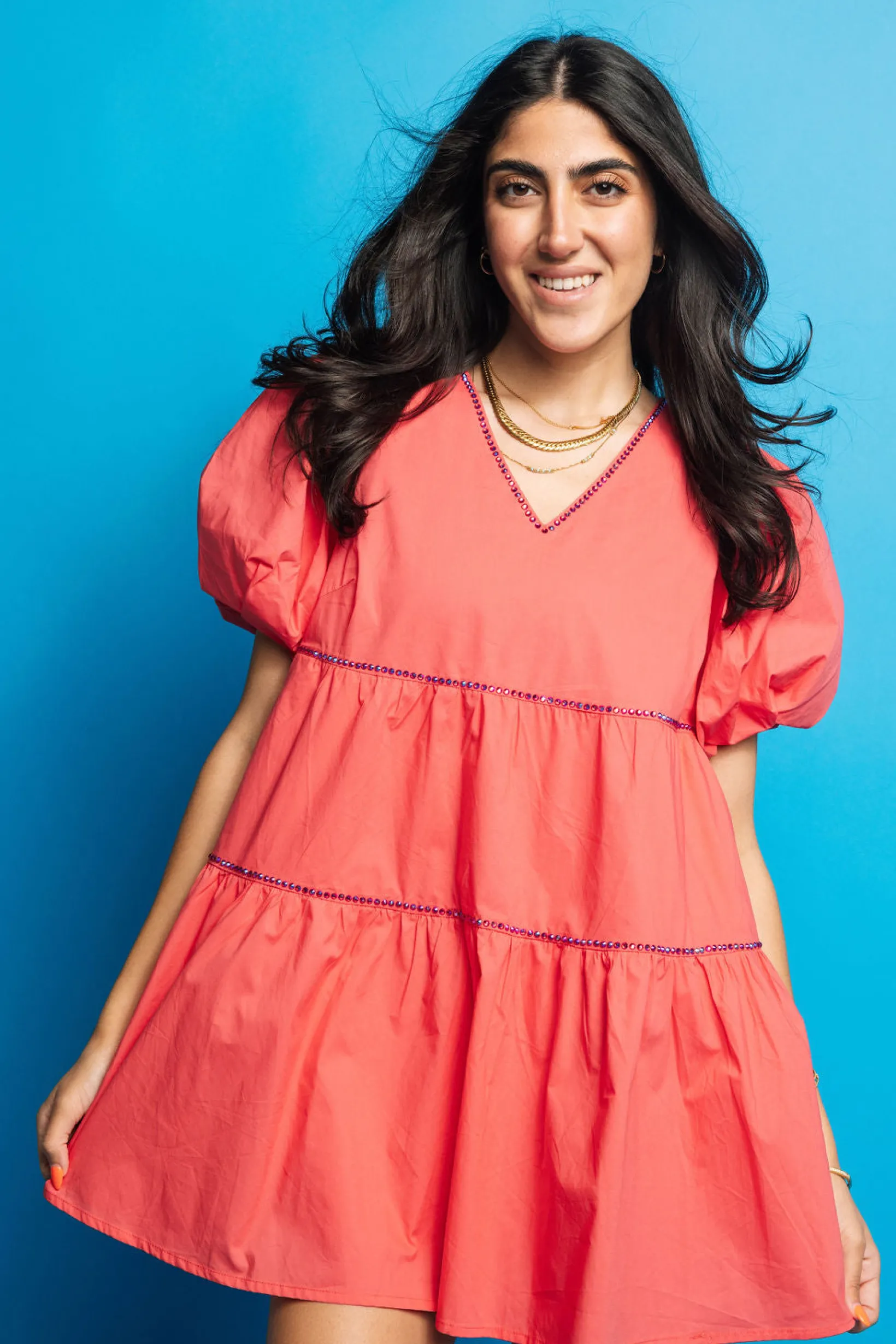 Get ready to make a statement with this Pink Firework Back Poof Sleeve Dress! The vibrant pink color and rainbow sequin fireworks on the back make this dress perfect for your upcoming summer celebrations. Don’t miss out on this fun and playful dress, perfect for Memorial Day and 4th of July! 🎇✨