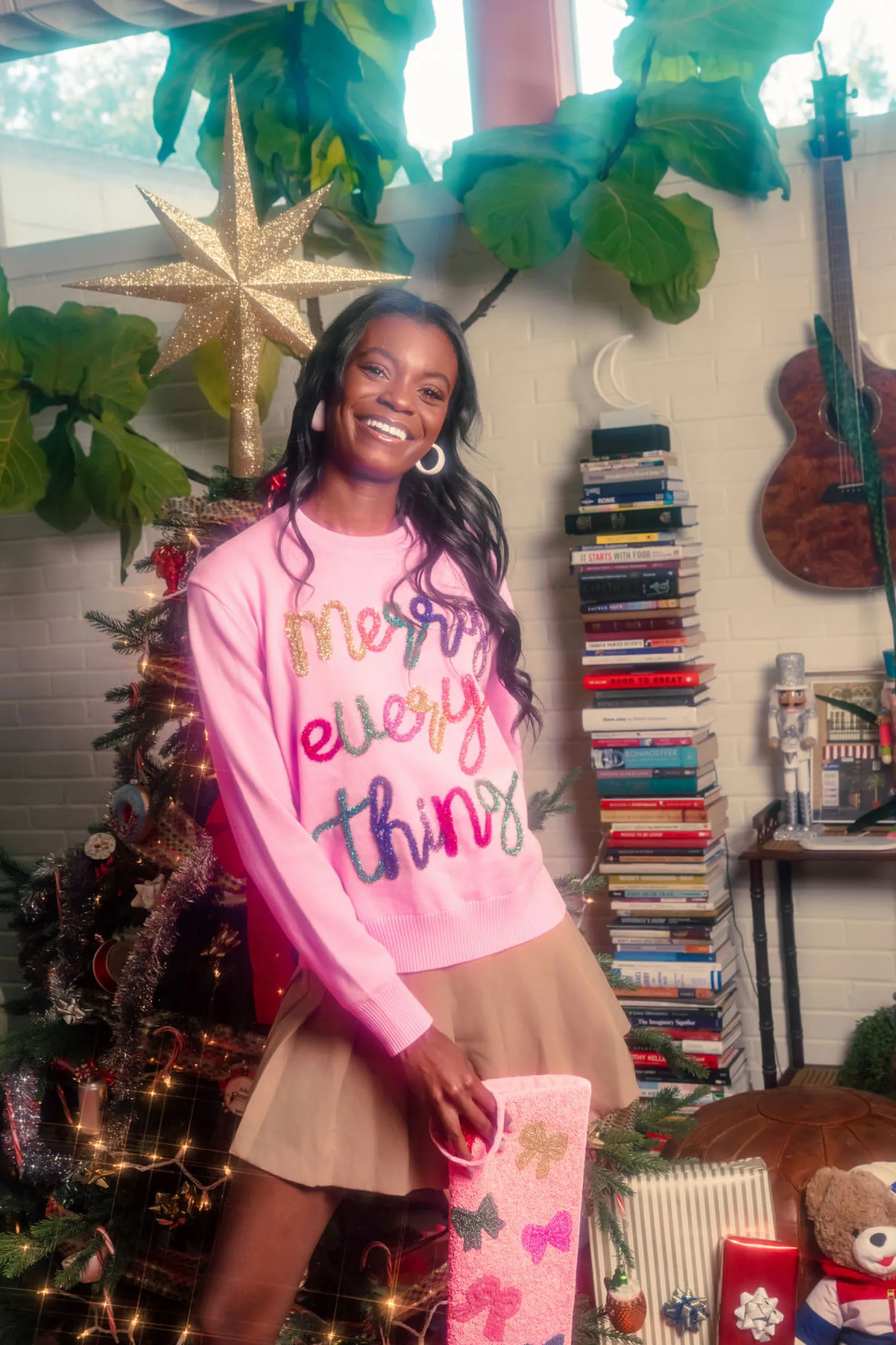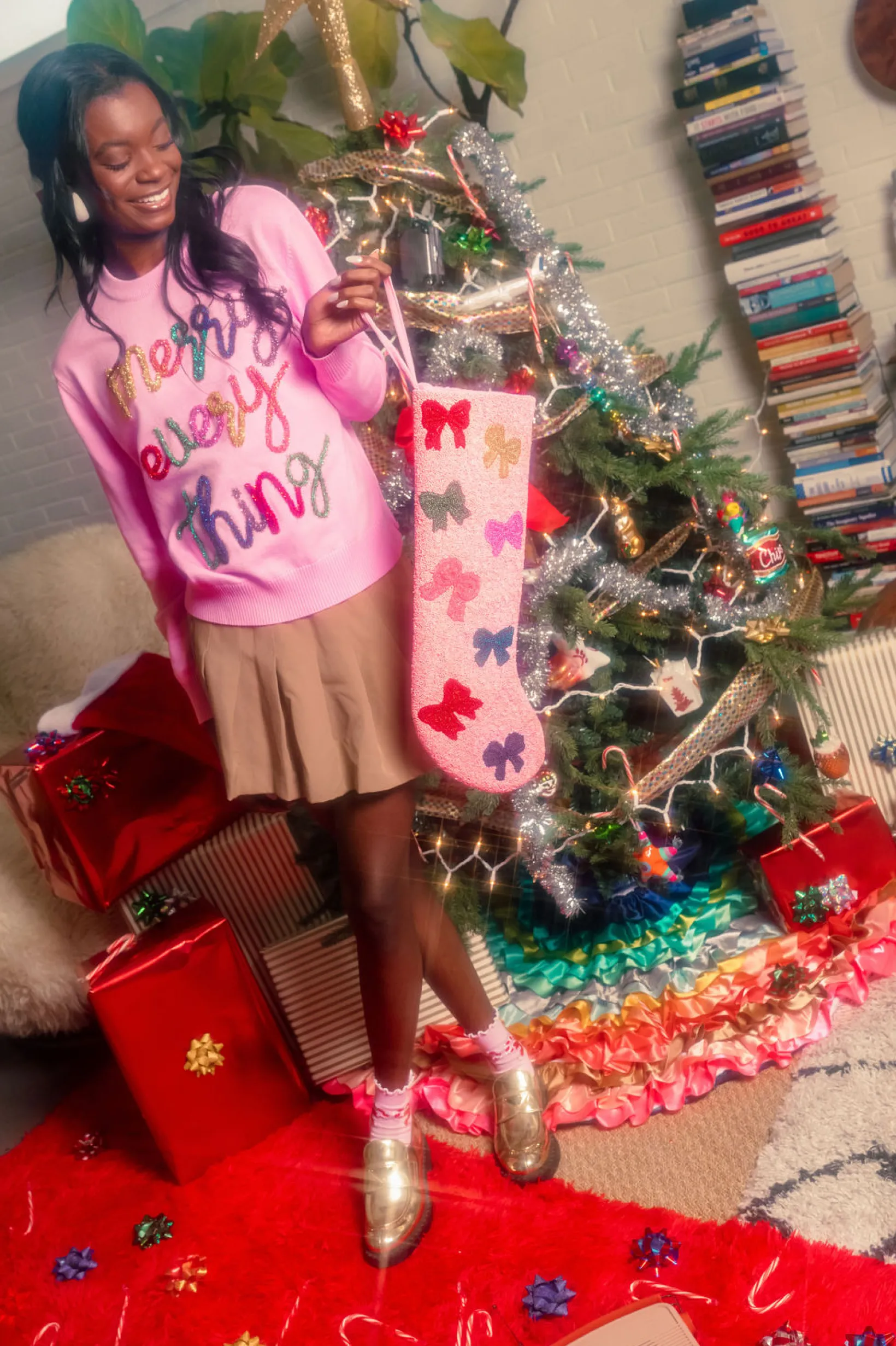 This Pink Merry Everything Glitter Script Sweater is perfect for a festive look! It features our infamous glitter script with a “Merry Everything” design, a slightly cropped and loose fit for a comfortable yet stylish feel. You’ll be sure to sparkle this season! Check out the matching kids version!