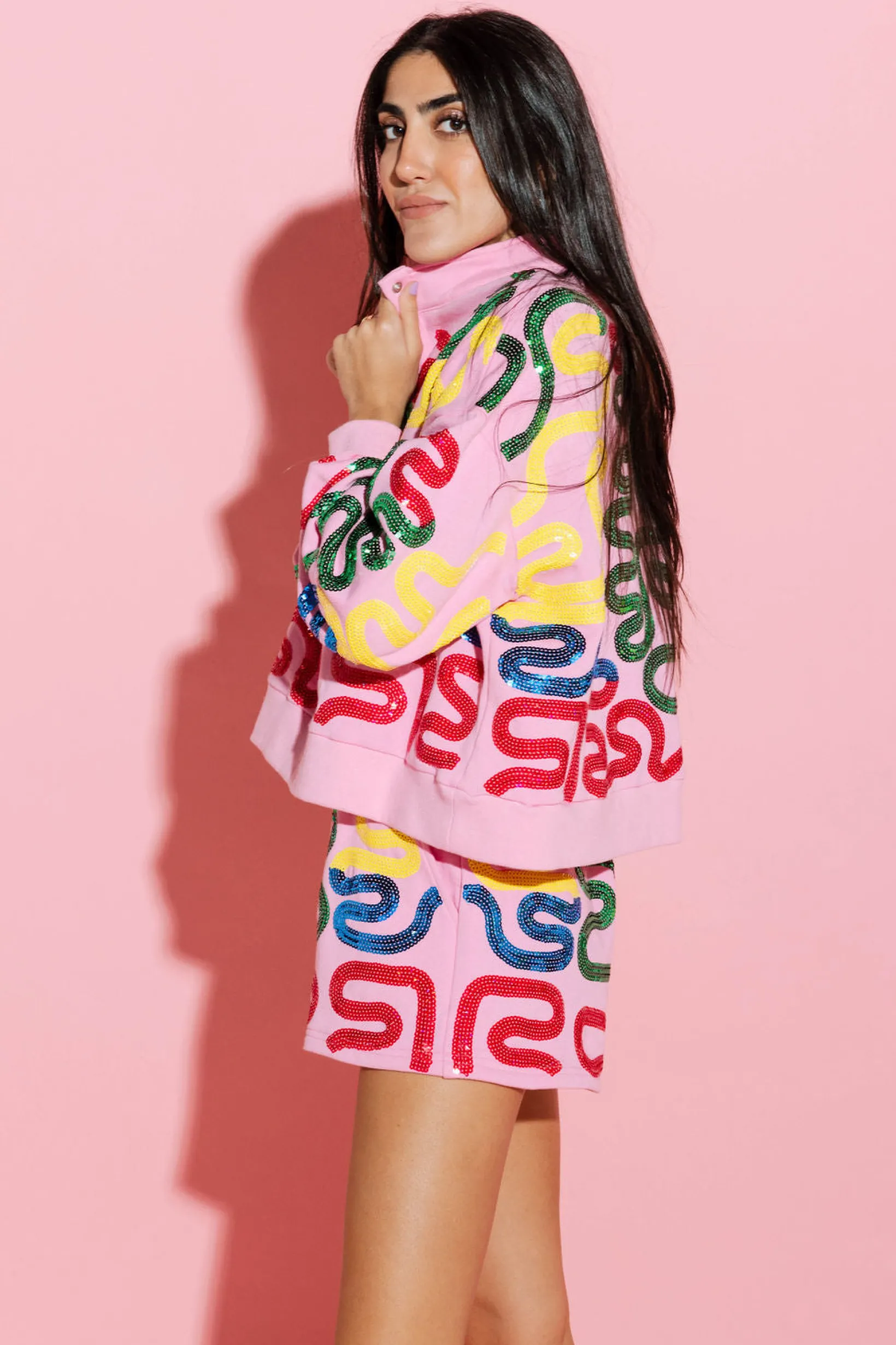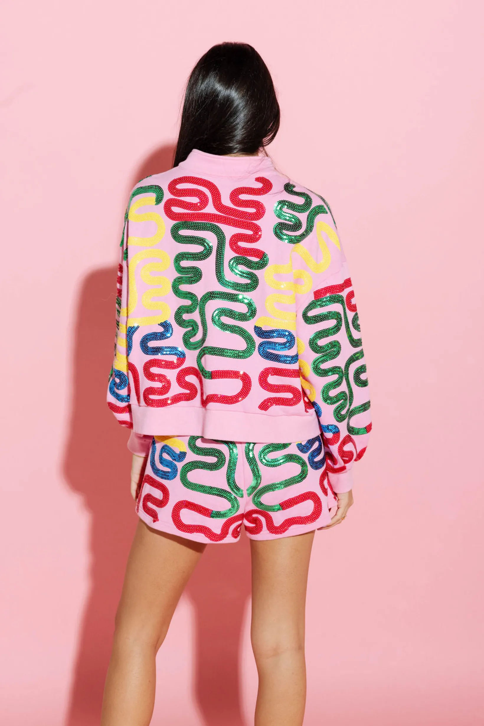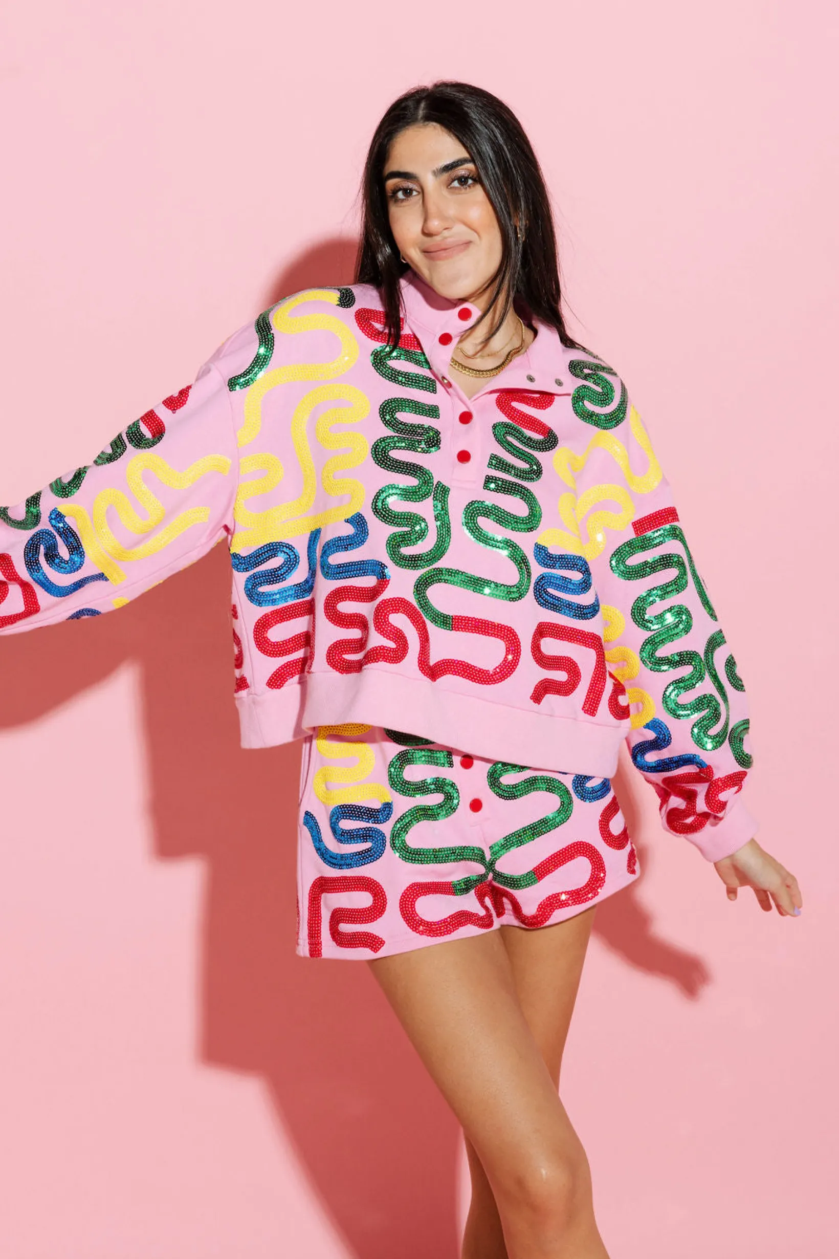 Experience ultimate comfort in these Pink Squiggle Henley Shorts, designed with a relaxed, high-waisted fit and made from soft sweat short material. Complete the look with the coordinating sweatshirt. 🍭