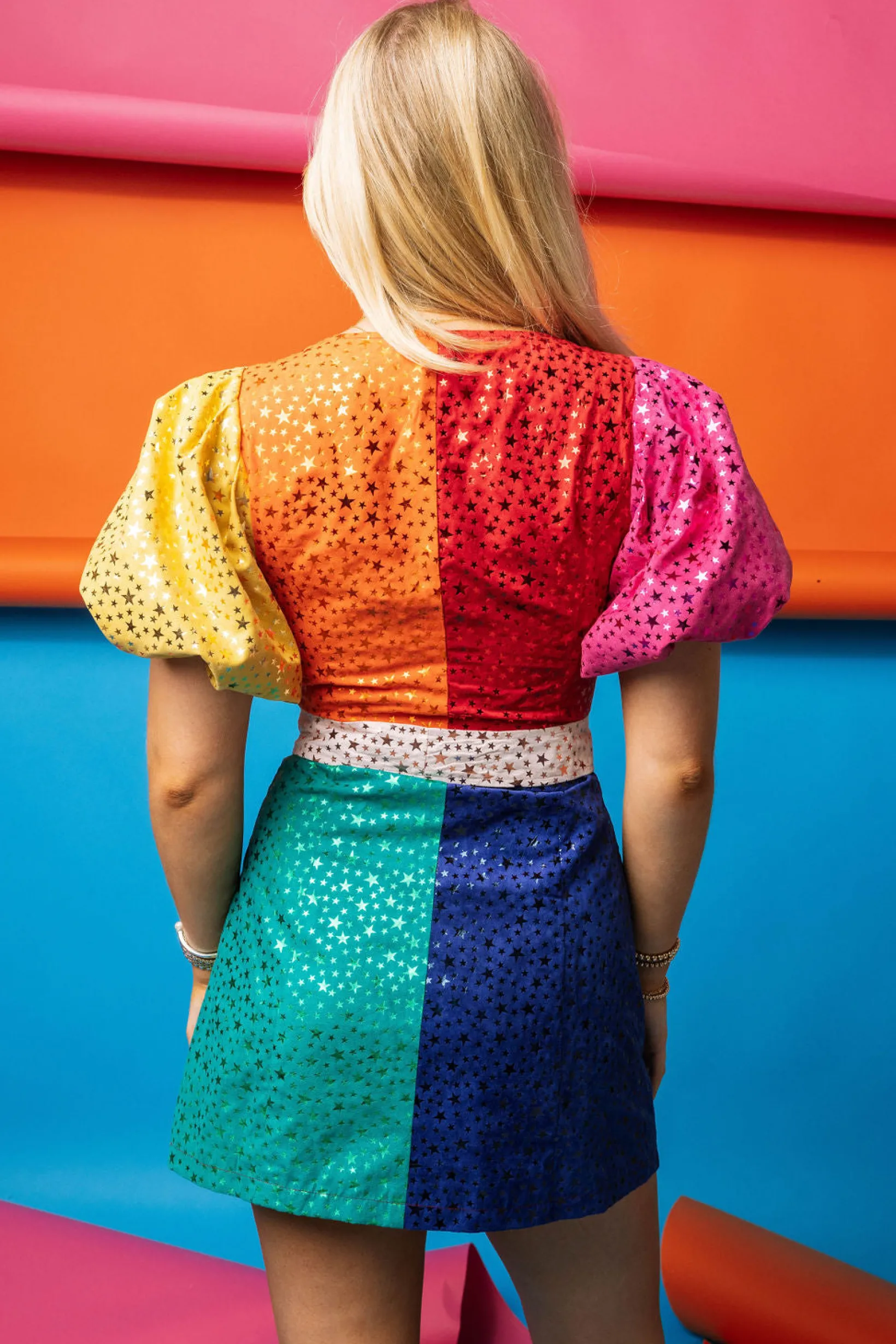 Add some flair to your wardrobe with our tie dress. Complete with a tie for a cinched waist, colorblock rainbow design, and metallic star detailing , you’ll be sparkling in no time✨🌈