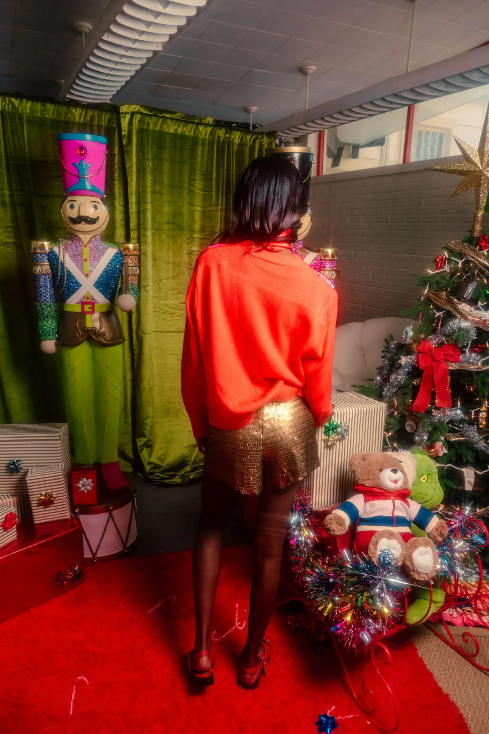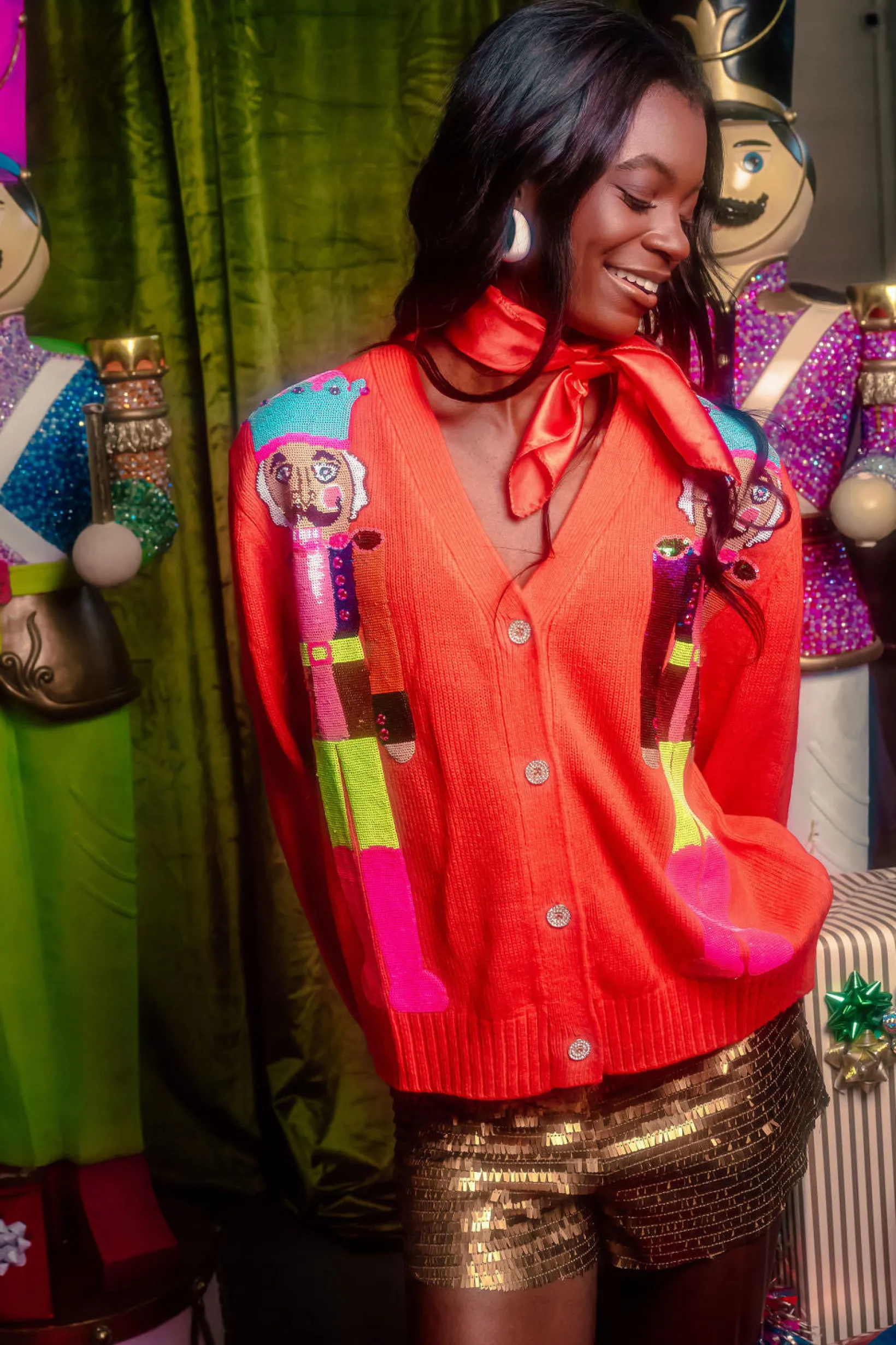 Stay cozy and stylish in our Red & Neon Nutcracker Cardigan. This loose and true-to-size cardigan features a sequin design based on our signature colorblock pieces. With its lightweight fabric, this cardigan is perfect for an evening look without feeling too heavy or bulky. Make this look complete with the matching skirt!