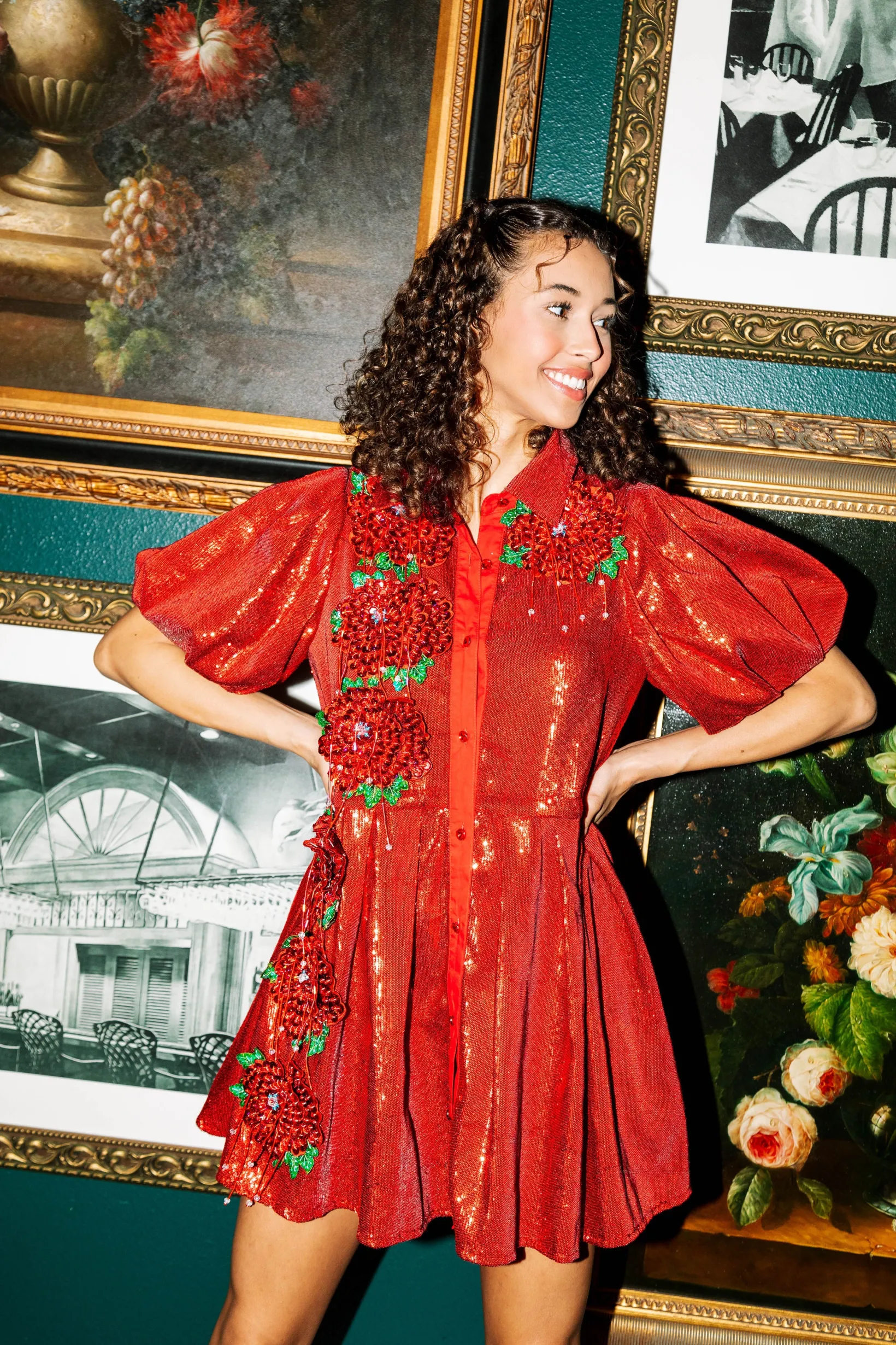 Stand out in our Red Sequin Flower Dress. This loose-fitting, full-sequin dress features poof sleeves and flower embellishments for a glamorous look. Shine and stand out at your next event in this must-have dress!