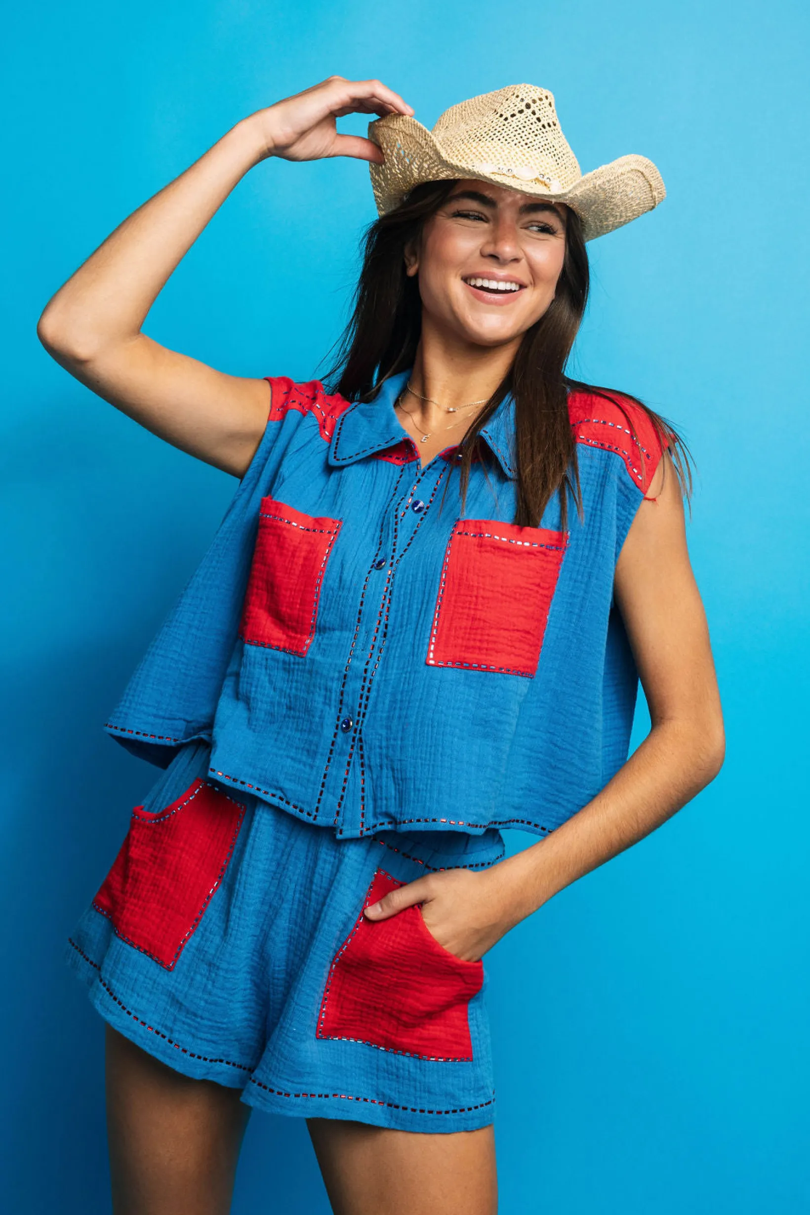 Made from a luxurious gauze fabric, these high-waisted, light weight shorts are designed to be both stylish and comfortable. The loose fit and special rhinestone detail provide a chic and trendy look. Perfect for any occasion, these Royal & Red Gauze Shorts are a must-have addition to your wardrobe. Shop the matching top! ❤️🤍💙