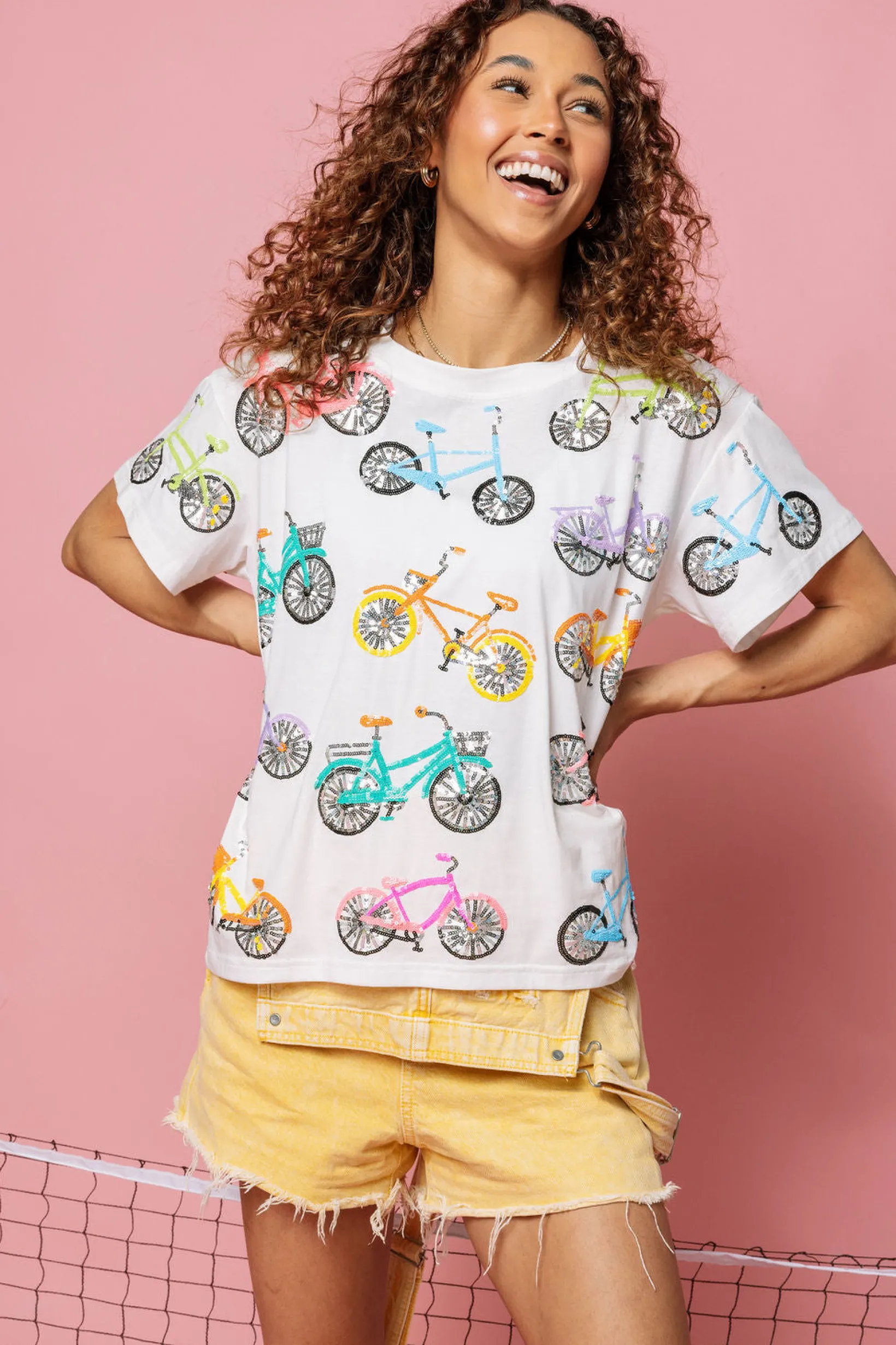 Get ready to ride with this playful tee! Meet our classic tee, complete with a sequined bicycle design. Perfect for casual days or biking adventures, this tee is a must-have for any fashion-forward cyclist.🚲✨