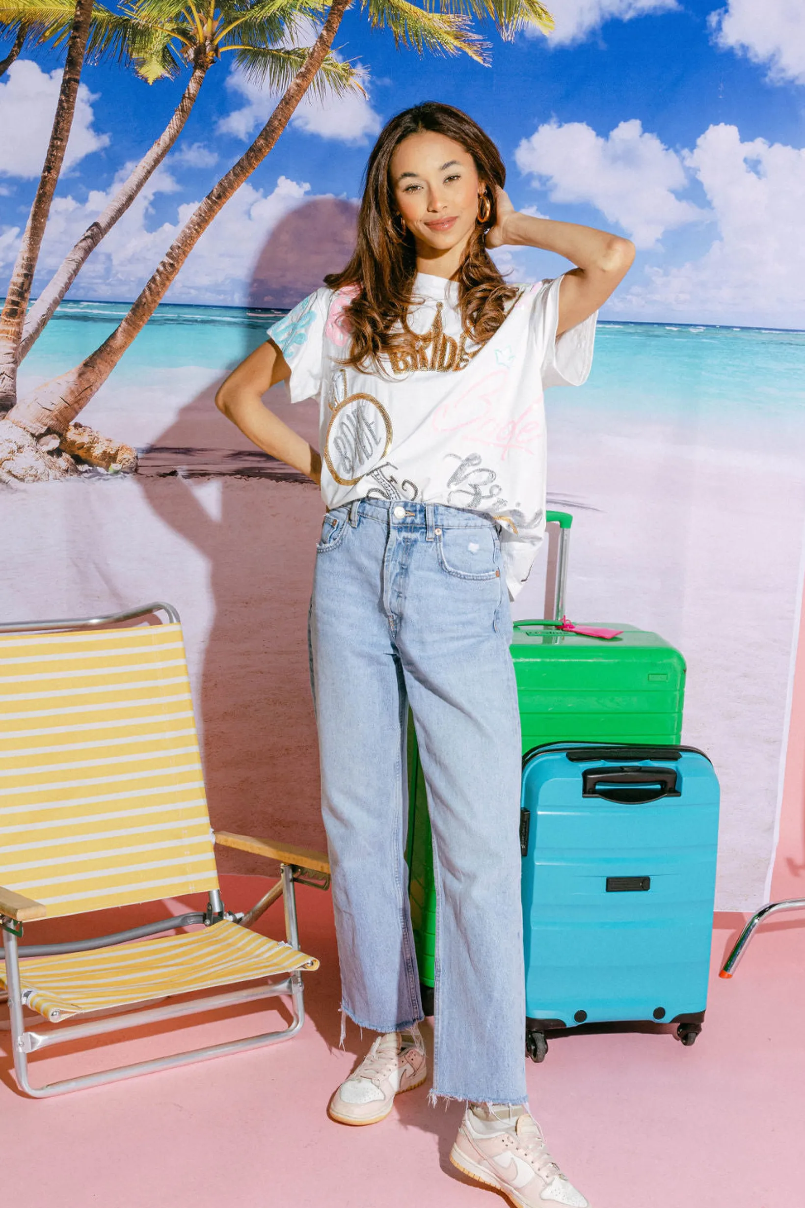 Upgrade your bridal game with our White Bride All Over Tee. This relaxed, accurate fit tee showcases a gorgeous sequin “Bride” graphic in different fonts. Great for any wedding, this tee brings a laid-back and stylish vibe to the pre-wedding festivities.👑💍