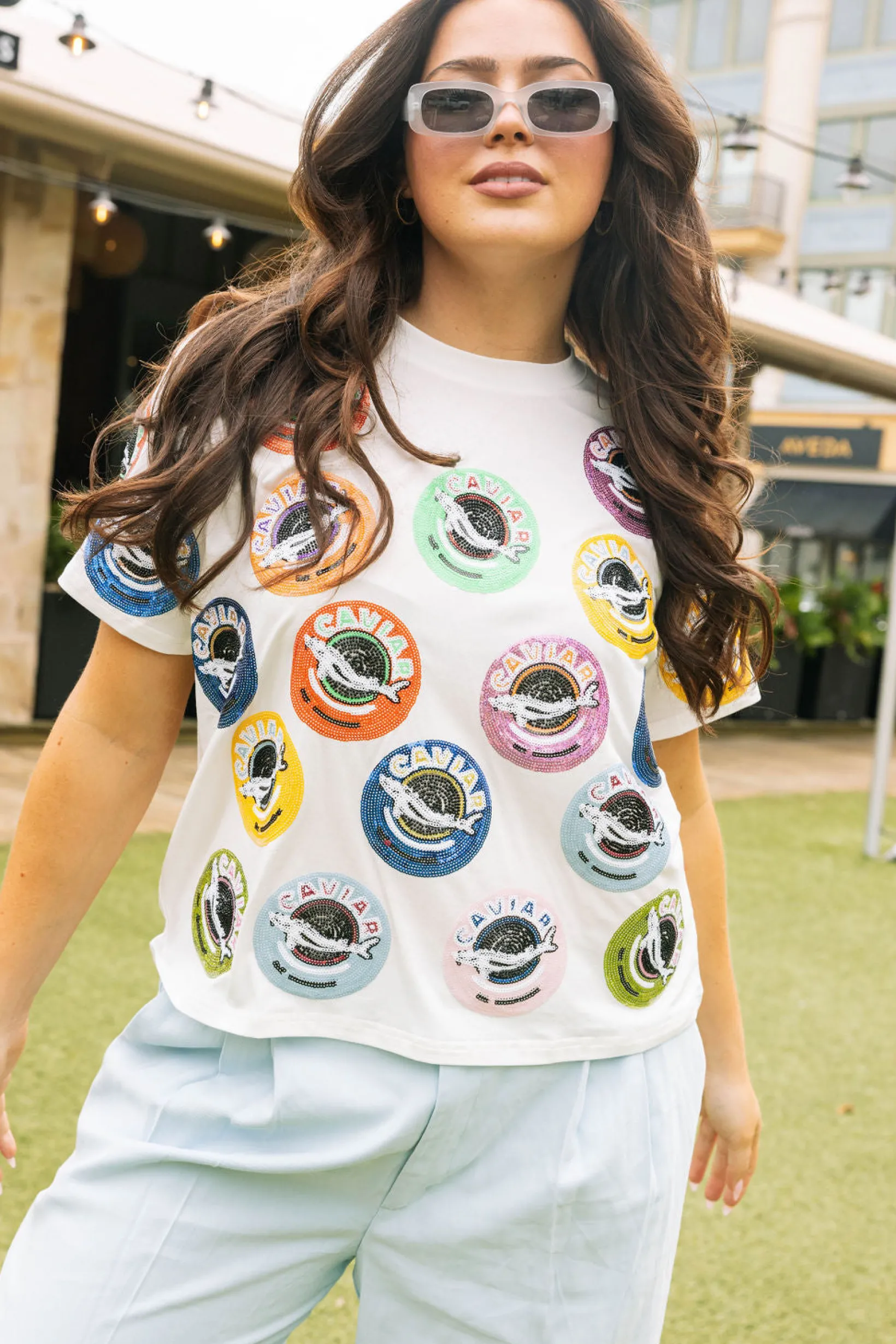 Meet our classic tee, complete with a sequin caviar tin design! ✨🍴