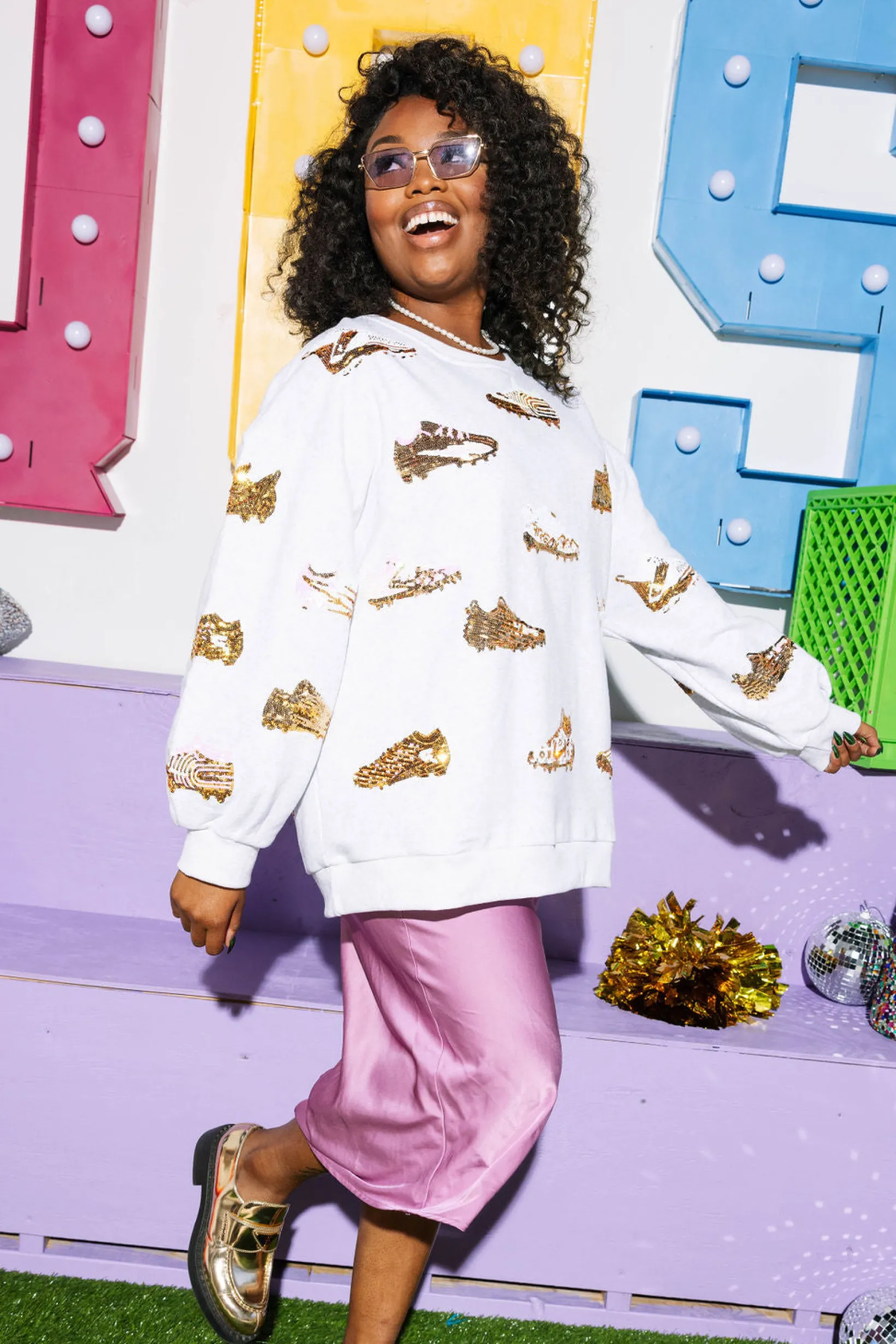 Get ready to be the most stylish fan at the game with our White & Gold Football Cleat Sweatshirt. Featuring gleaming gold accents and sequin cleat designs, this sweatshirt will have you standing out from the crowd. Perfect for showing your support for any football team, all while looking effortlessly chic. Game on!