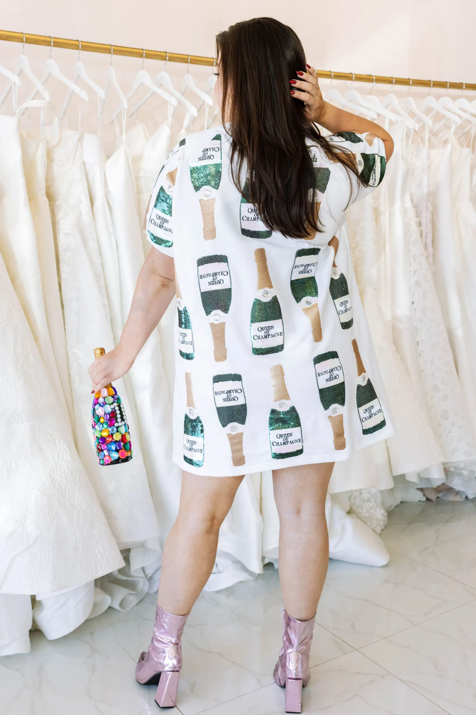 Look stunning and feel comfy in this oversized white and gold dress. Crafted from soft sweatshirt material, the piece is adorned with a sequin-scattered champagne bottle design for the perfect mix of style and comfort.Be the blushing bride you’ve always wanted to be (or at least look like one)! 🍾🥂