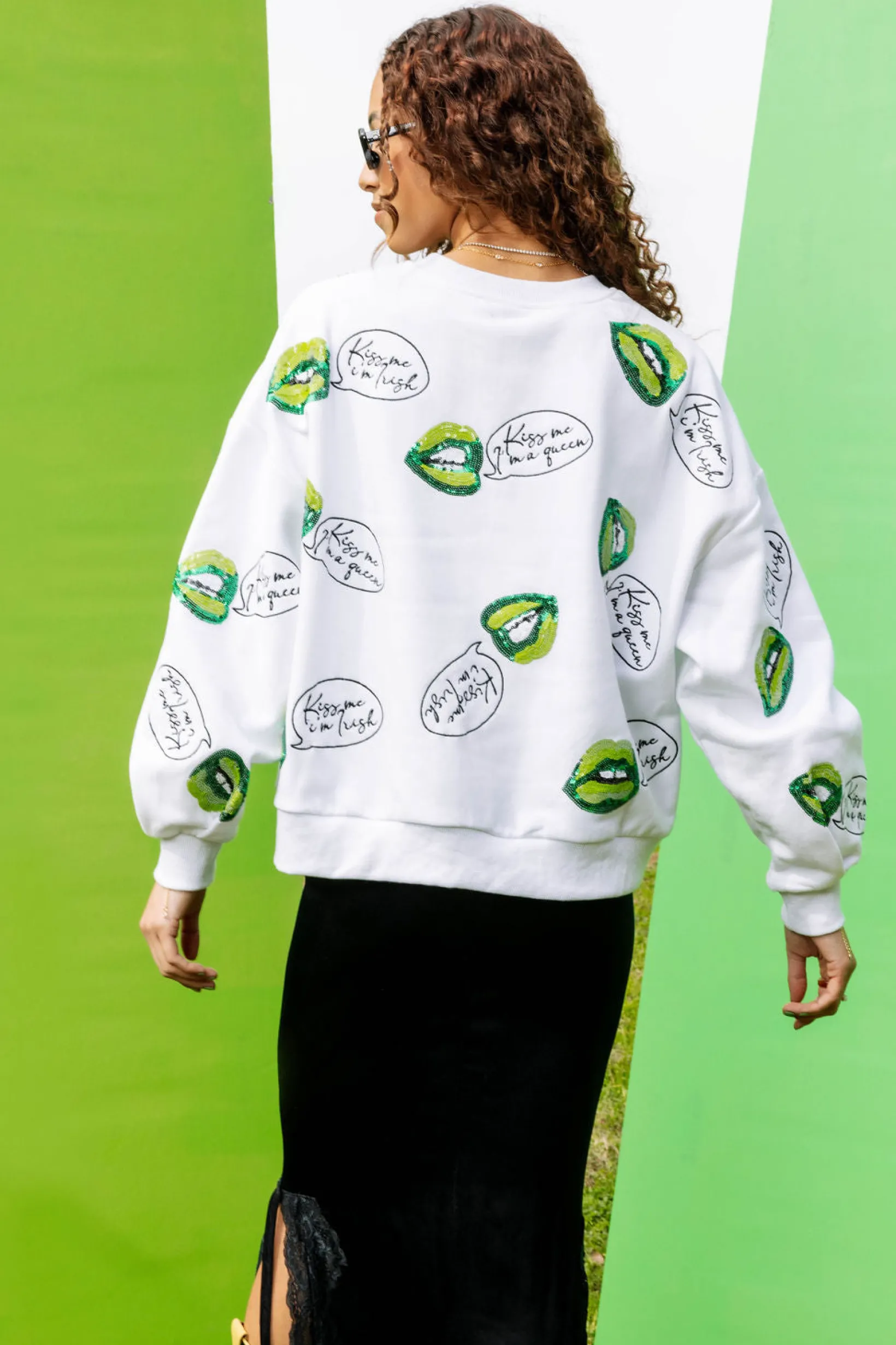 Embrace your adventurous side with our White & Green Scattered Kiss Me I’m a Queen Sweatshirt! Featuring a playful design and comfortable fit, this sweatshirt is perfect for those who take risks and dare to be different. Step out of your comfort zone and show the world that you’re a fearless queen! 🍀💋