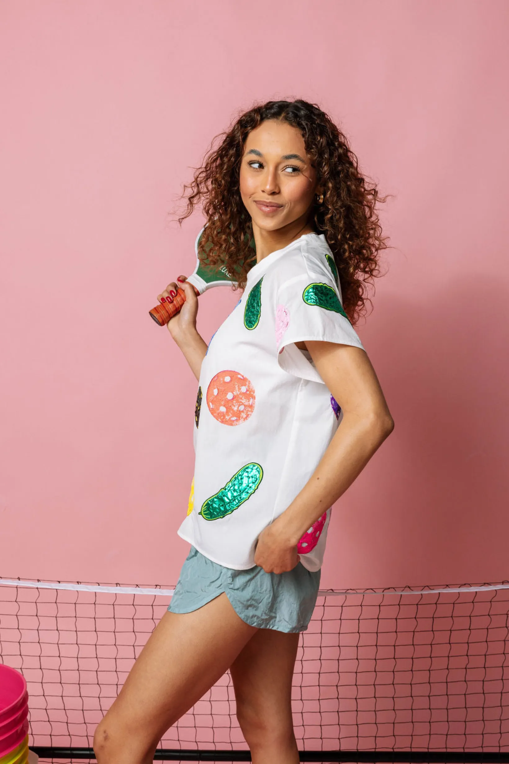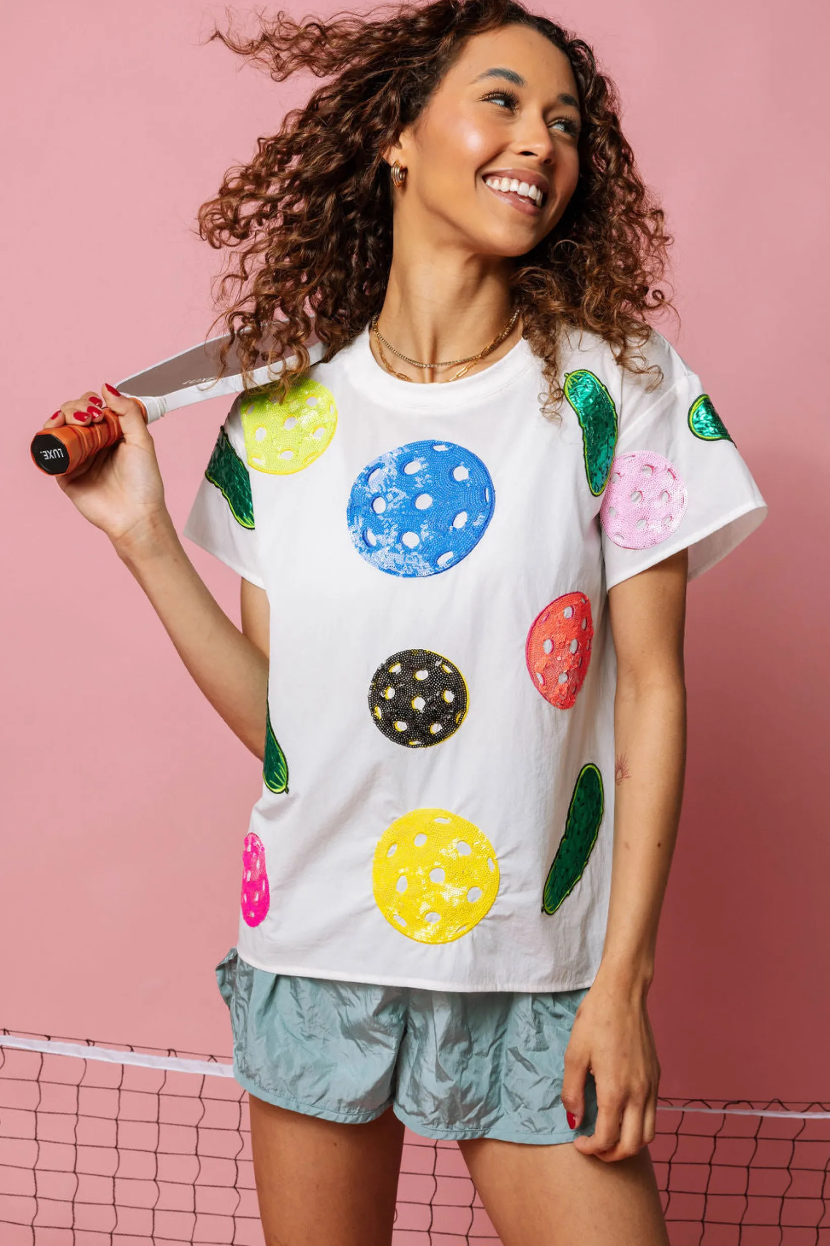 Serve up some fun with this White Multi Pickle Ball Active Tee. Its eye-catching pickleball design will make every game a hit. A perfect blend of style and functionality, this tee is bound to lob over the competition. Game on!✨💋